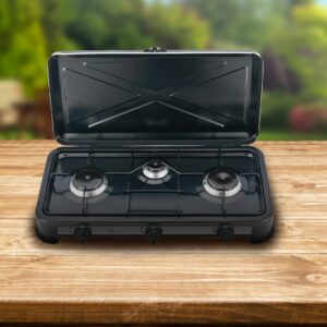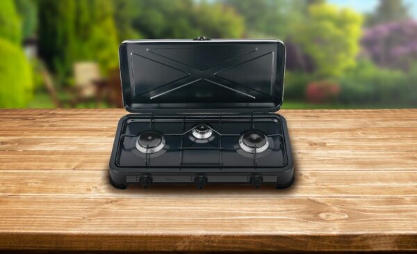 3-Flammen-LPG-Gaskocher für den Außenbereich. LPG-Betrieb. Lackierte Stahlkonstruktion mit Kunststofffüßen, Aluminiumbrennern, emaillierten Brennerkappen und abnehmbarem Grill. Einstellbare Flamme. Schwarze Farbe. Ausgestattet mit einem Deckel, um den Transport zu erleichtern und den Einsatz im Freien zu erleichtern.