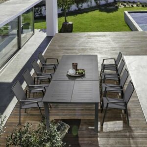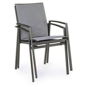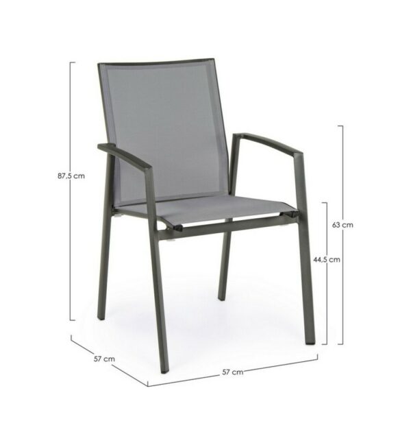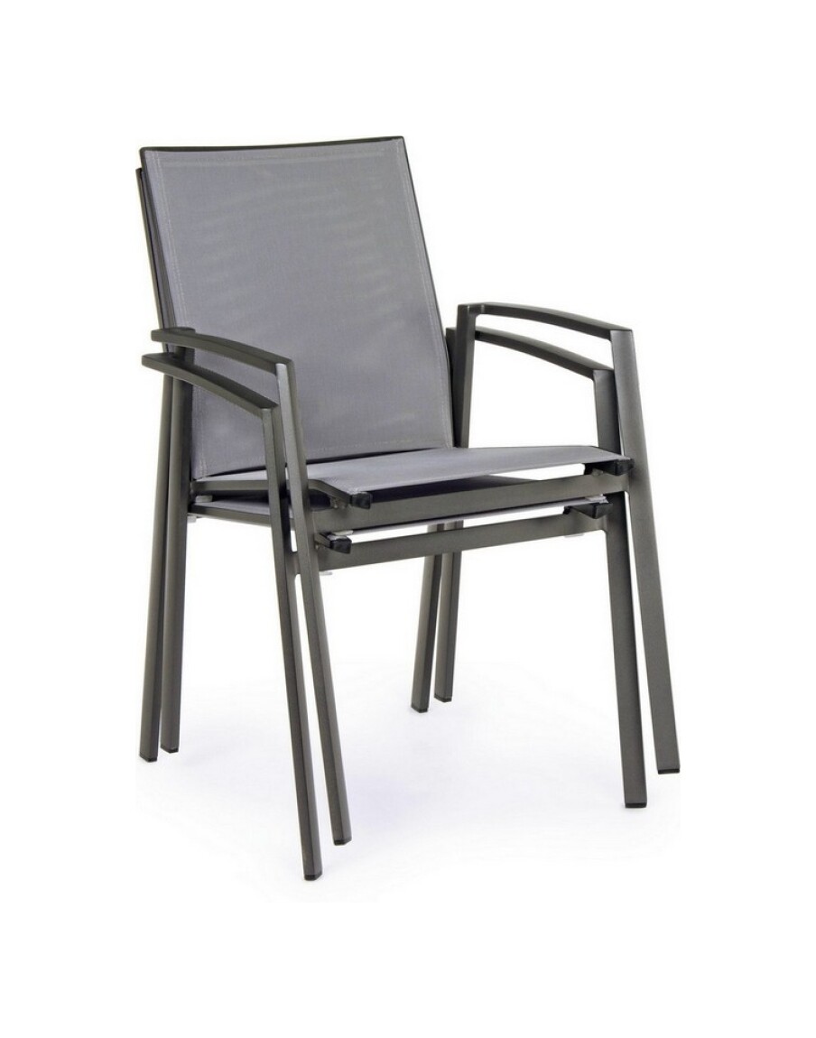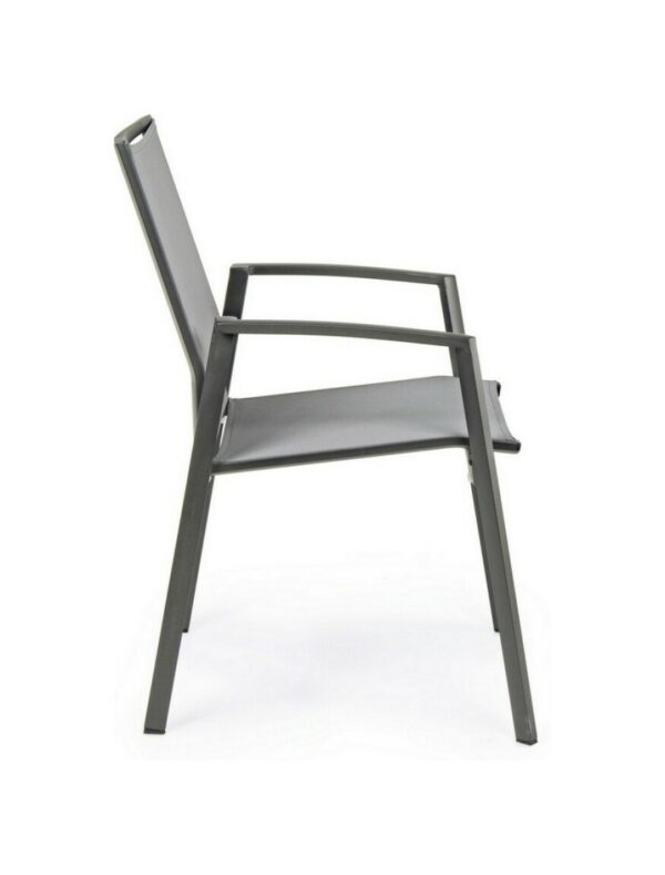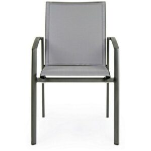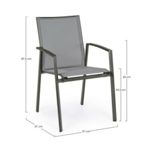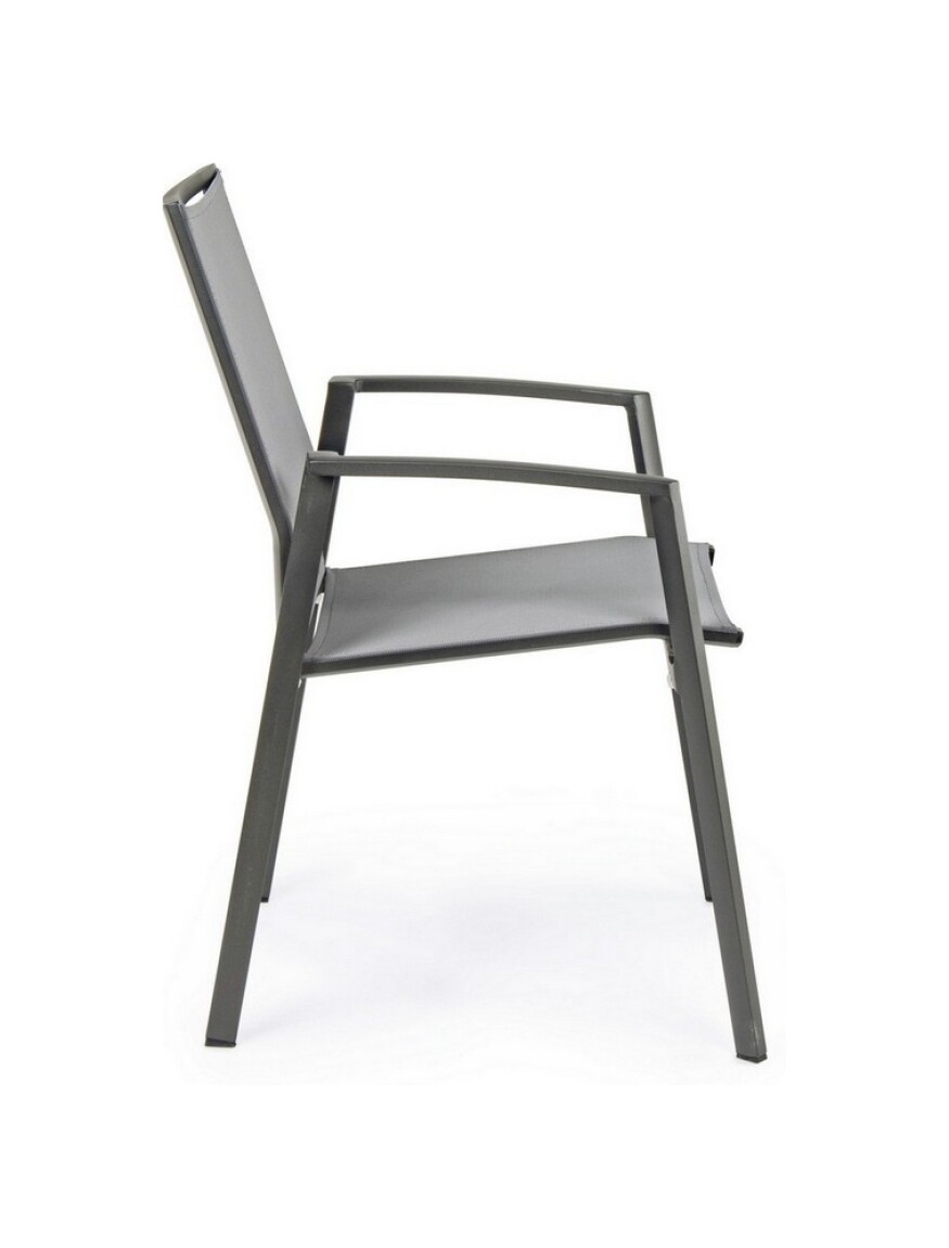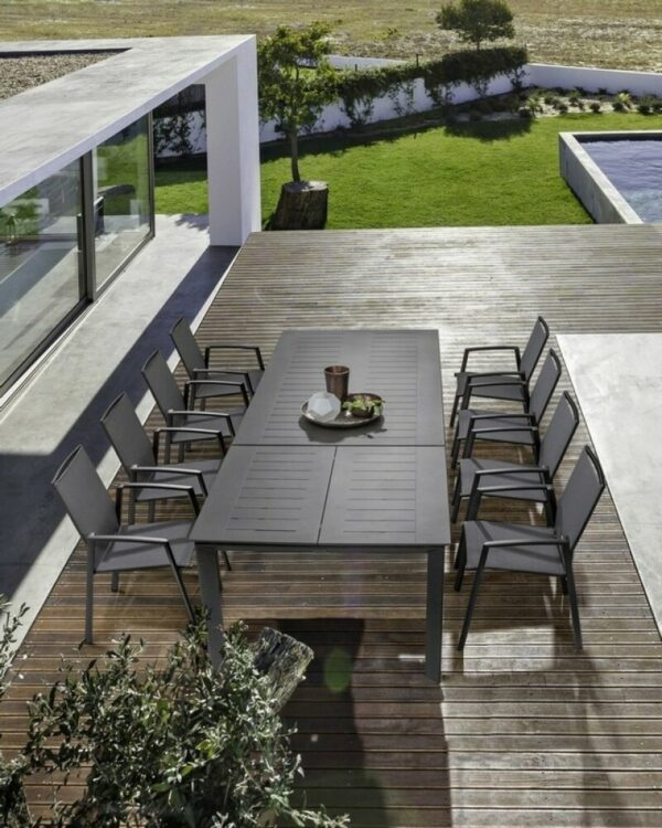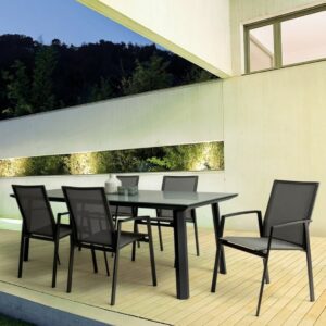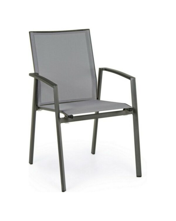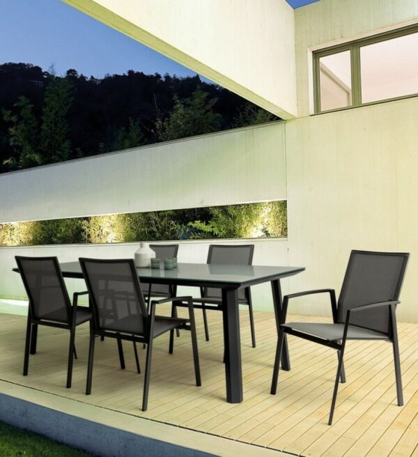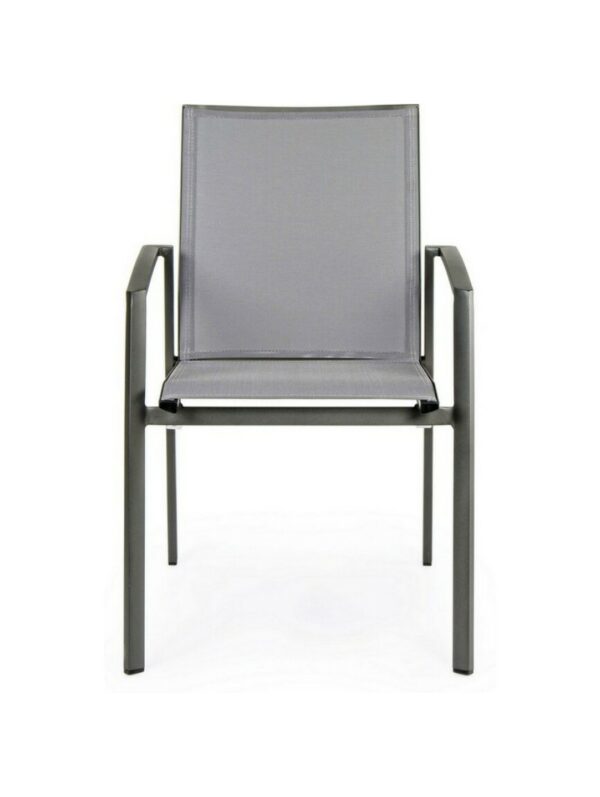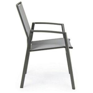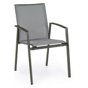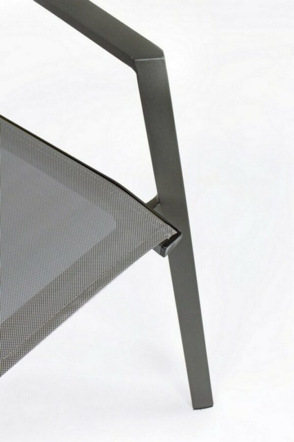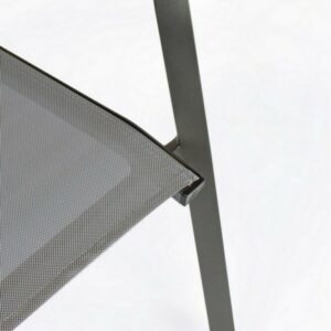 Die Struktur besteht aus anthrazitfarbenem, pulverbeschichtetem Aluminium (Polyester), während Sitz und Rückenlehne mit Textilene Phifer 1×1 bezogen sind.