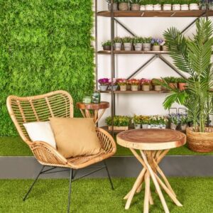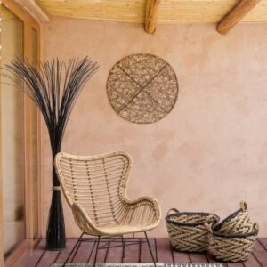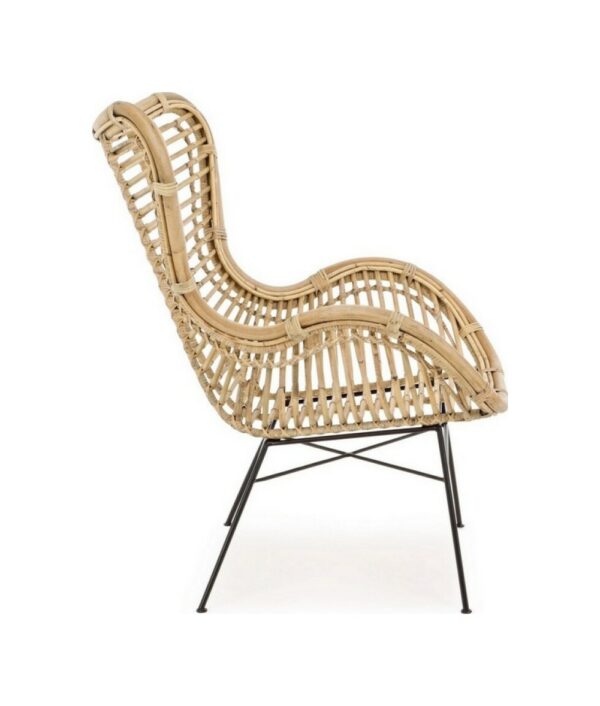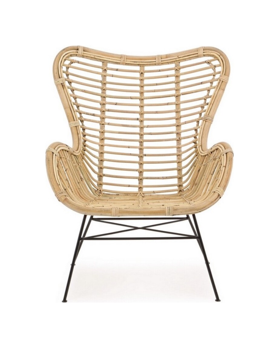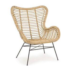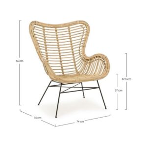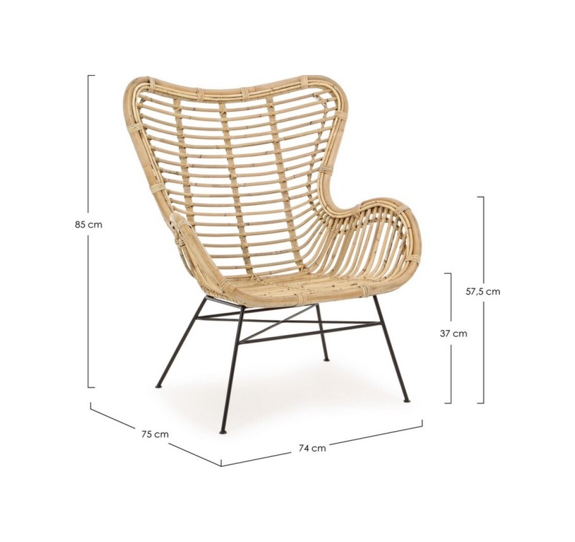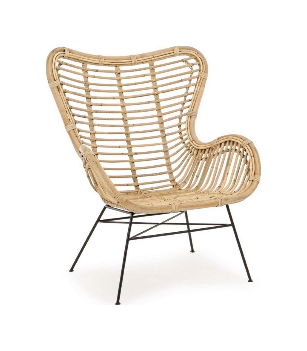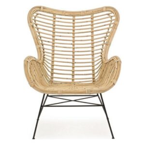 Die Beine sind aus pulverbeschichtetem Stahl, während der Sitz aus Rattan besteht und mit Melaminfarbe lackiert ist.