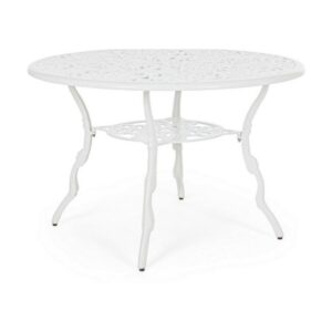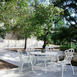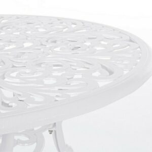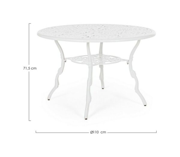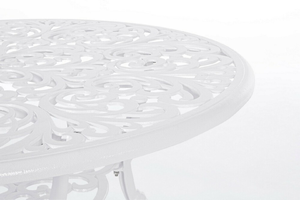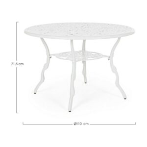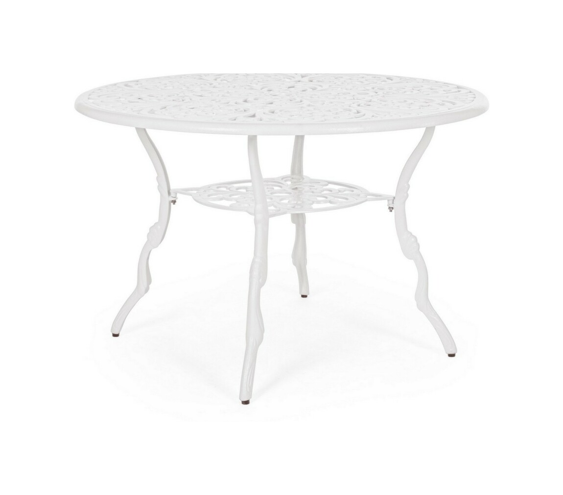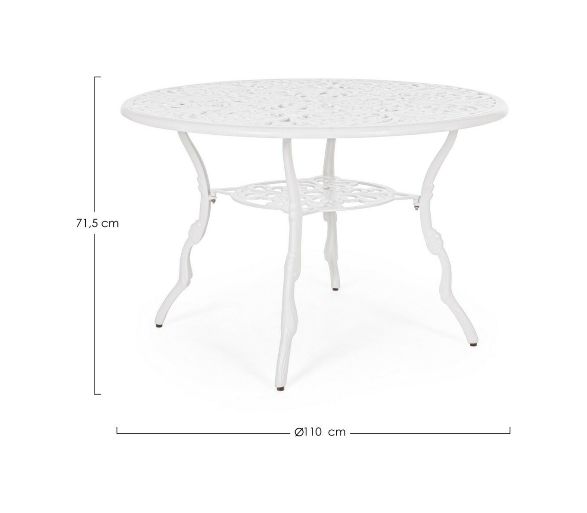 Victoria von Bizzotto ist ein feststehender runder Design- Tisch, der sich ideal für die Dekoration eines Wohnbereichs im Freien mit dem typischen Geschmack traditioneller, von der Romantik inspirierter Gärten eignet.