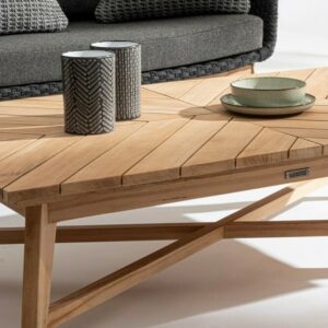 Ein Couchtisch, der sich durch sein Design, den sehr warmen Naturton des Holzes und die enthaltenen Volumen auszeichnet.