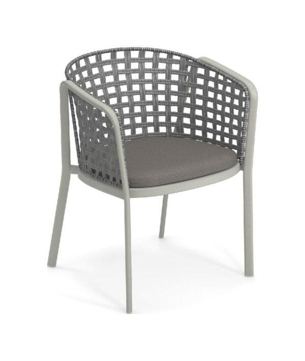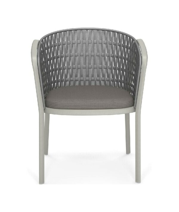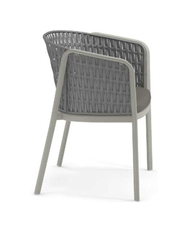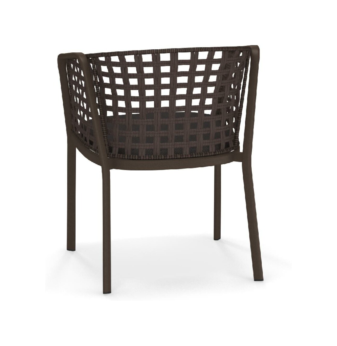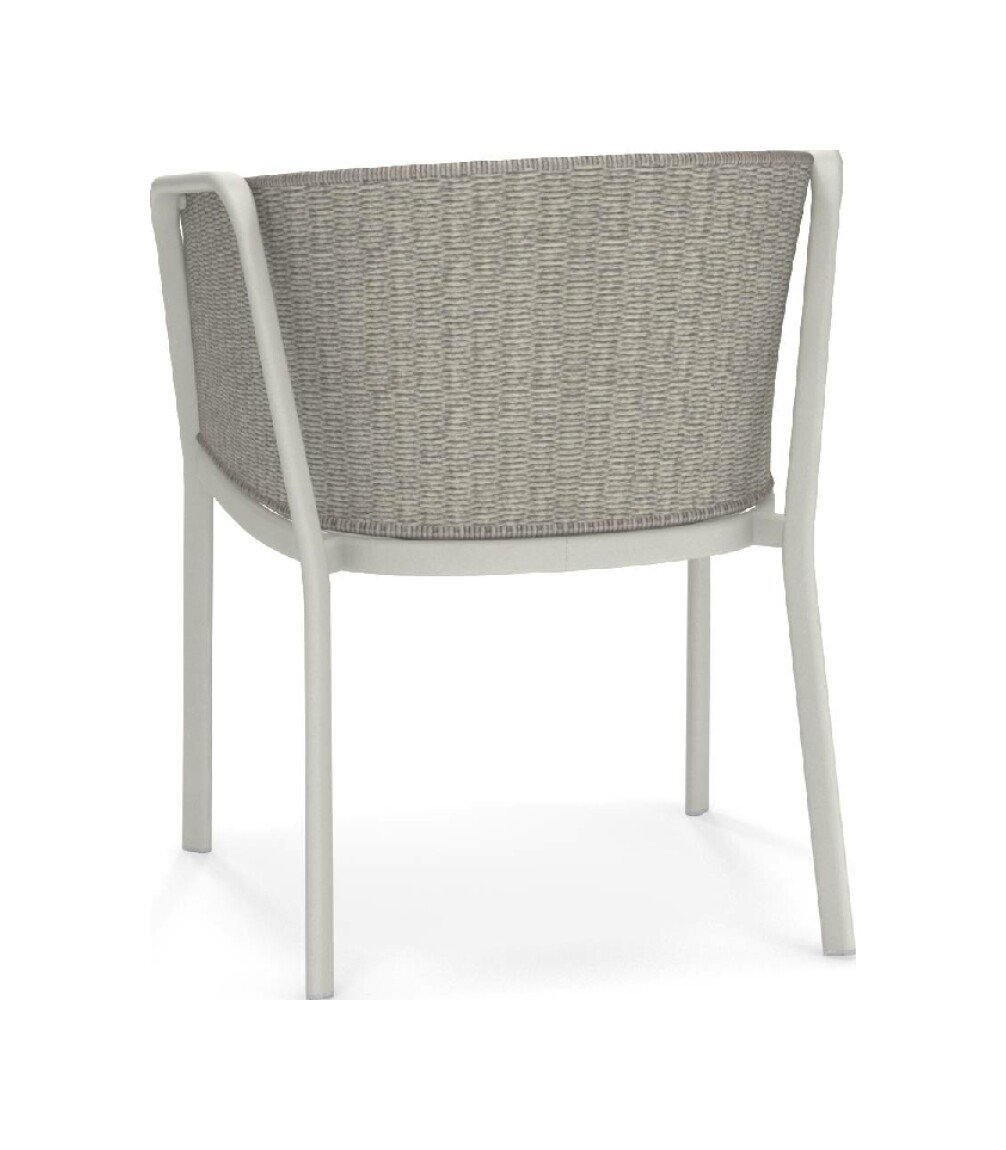 EMU CAROUSEL 1212/1213/1214 ist ein kleiner Sessel mit lackierter Aluminiumstruktur   und Rückenlehne mit Stahlstruktur, auf der dekorative Geflechte aus wasserabweisendem Synthetikseil in dichter, quadratischer oder flacher Webart angebracht sind.