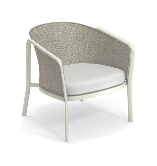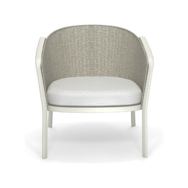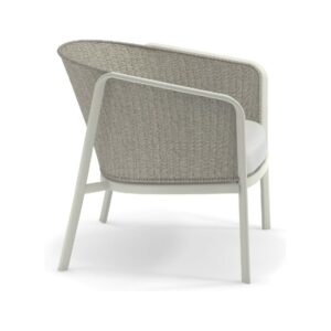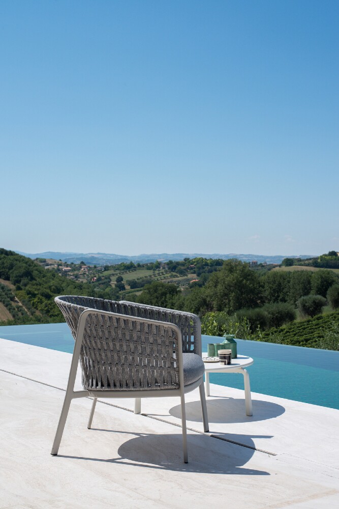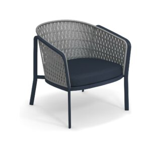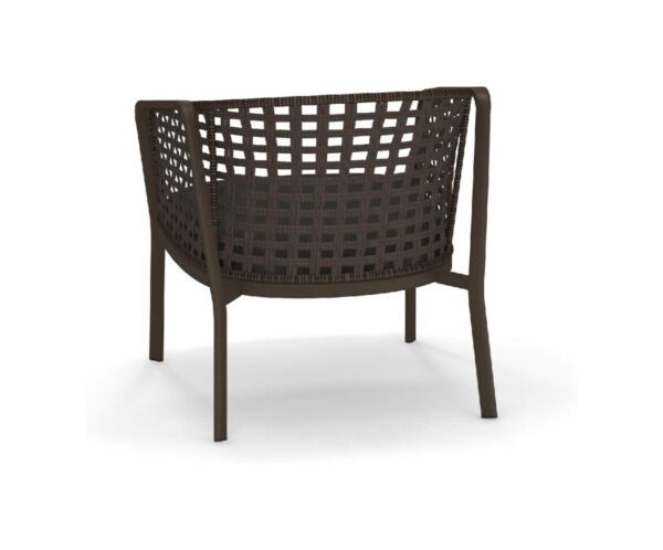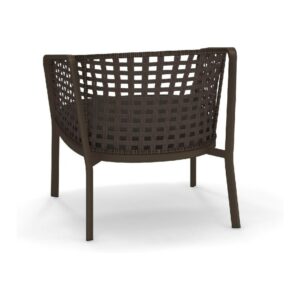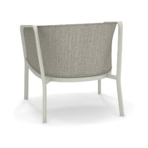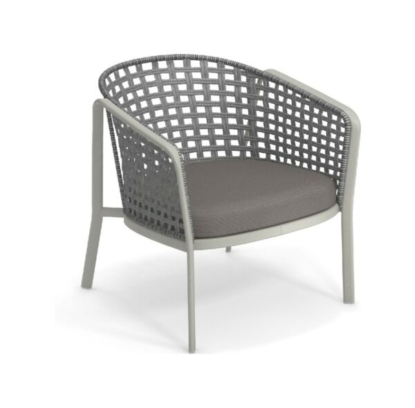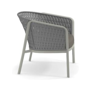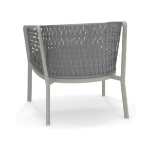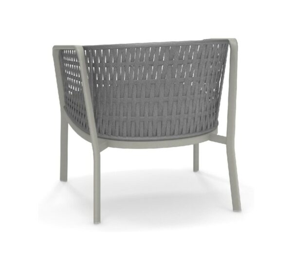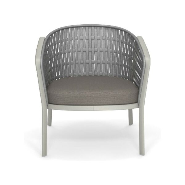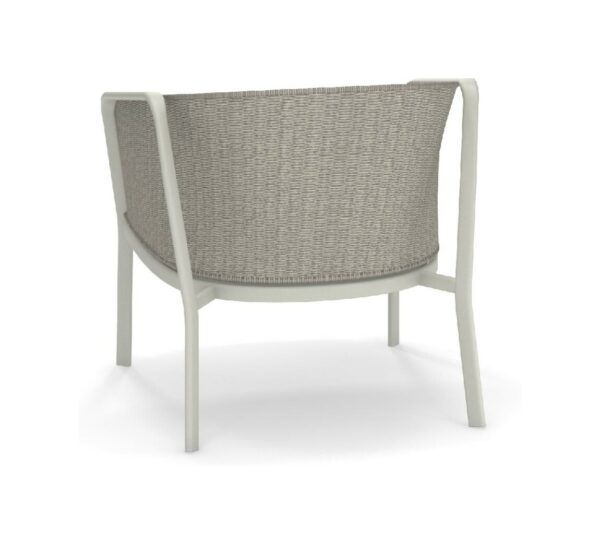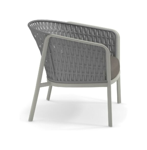 EMU CAROUSEL 1216/1217/1218 ist ein Sessel mit lackierter Aluminiumstruktur und Rückenlehne mit Stahlstruktur, auf der dekorative Geflechte aus wasserabweisendem Synthetikseil in dichter, quadratischer oder flacher Webart angebracht sind.