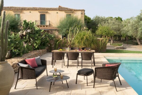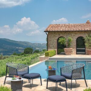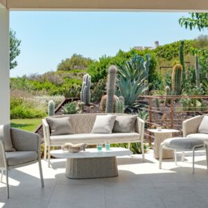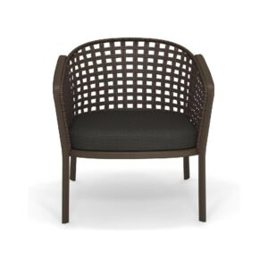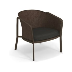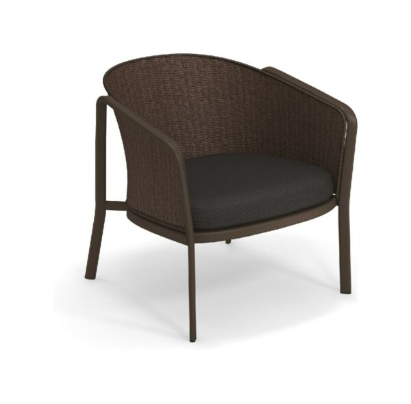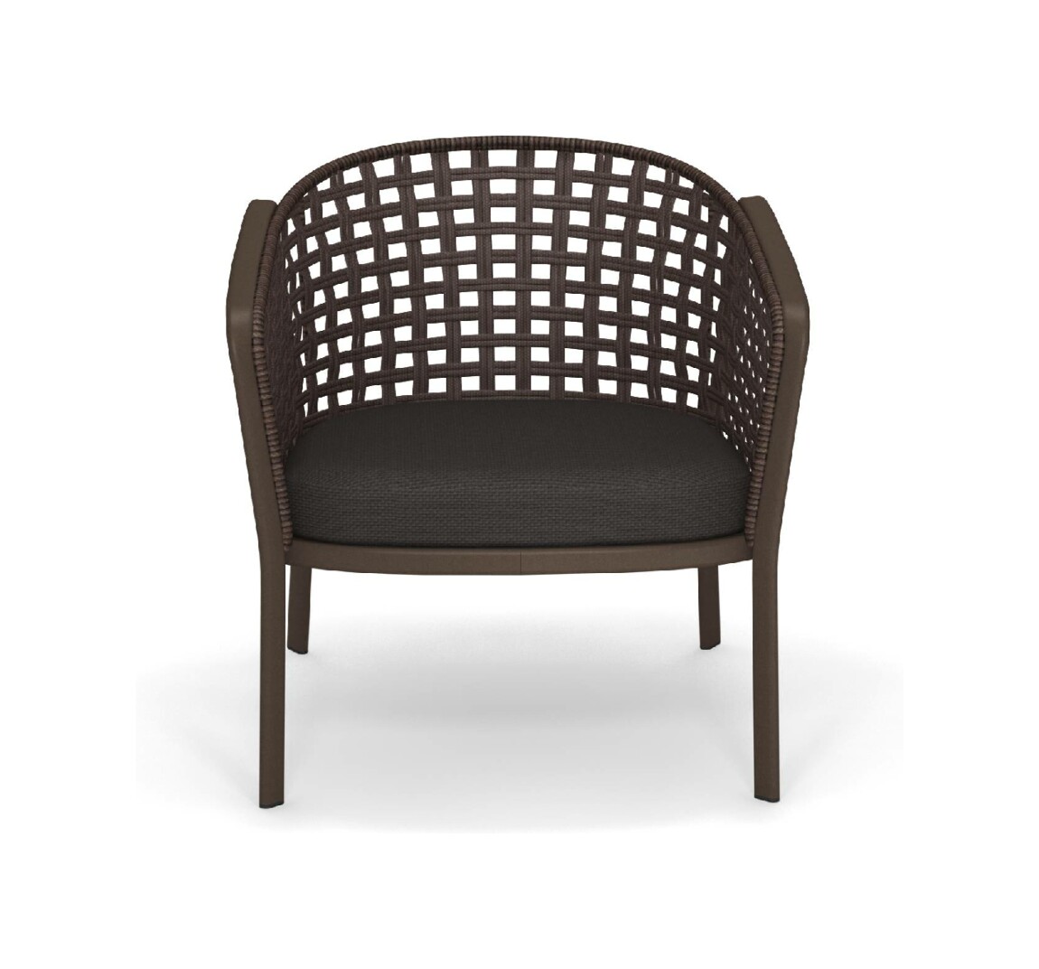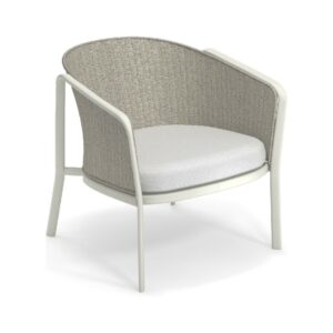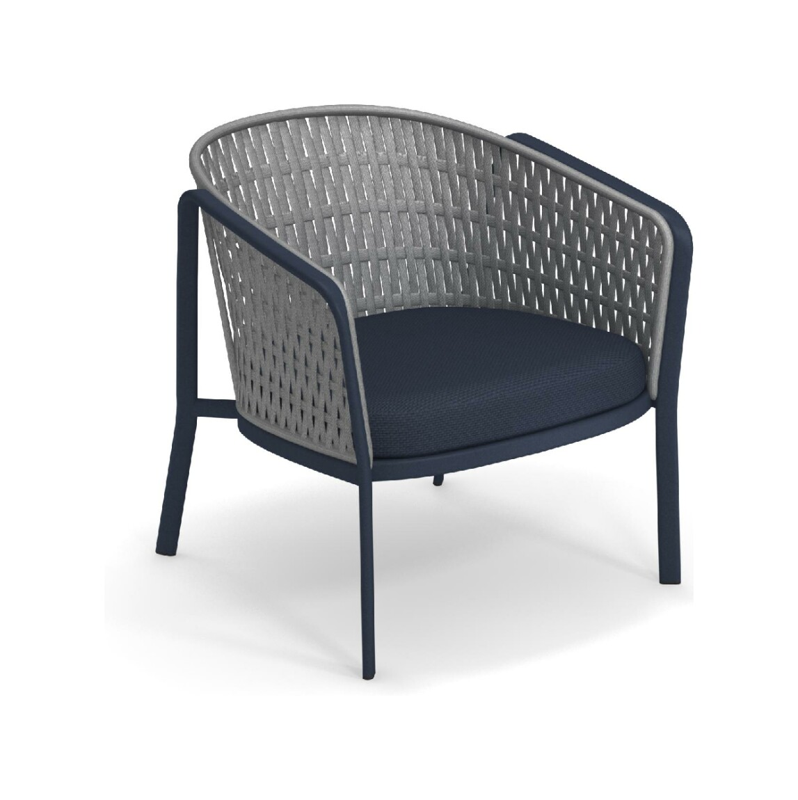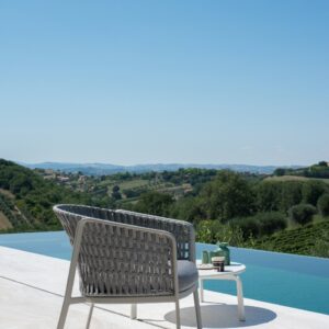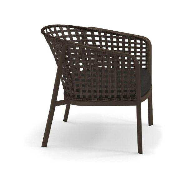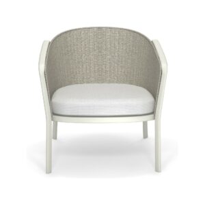 EMU CAROUSEL 1216/1217/1218 ist ein Sessel mit lackierter Aluminiumstruktur und Rückenlehne mit Stahlstruktur, auf der dekorative Geflechte aus wasserabweisendem Synthetikseil in dichter, quadratischer oder flacher Webart angebracht sind.