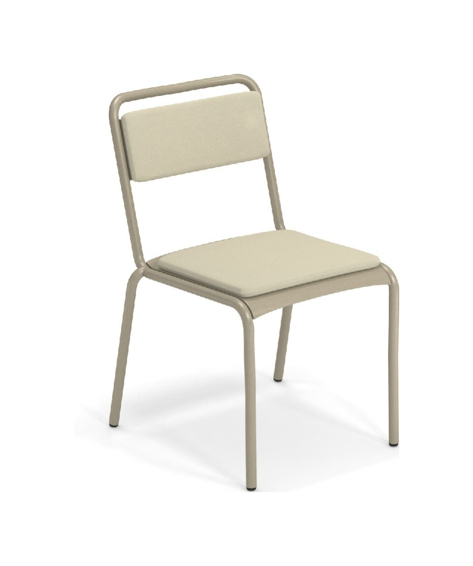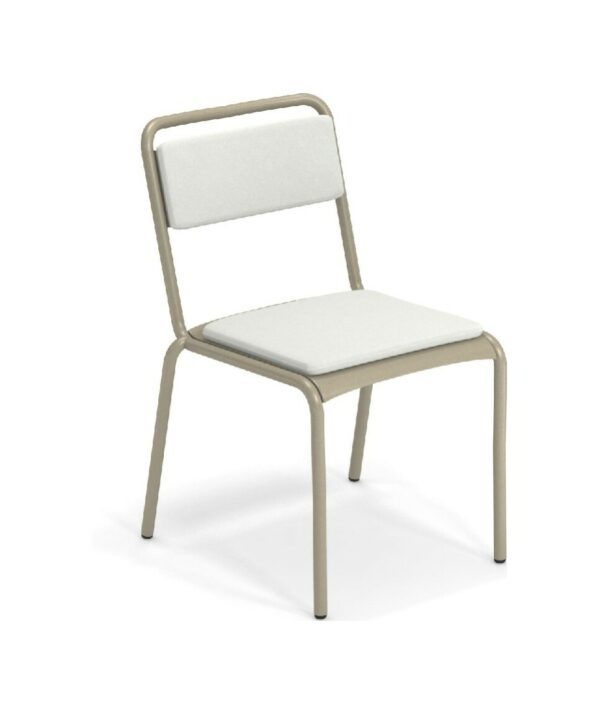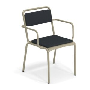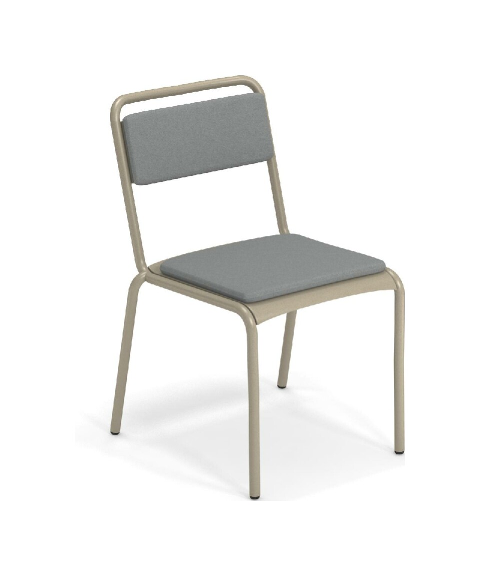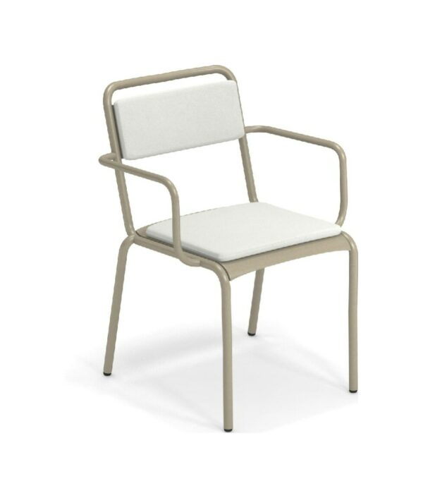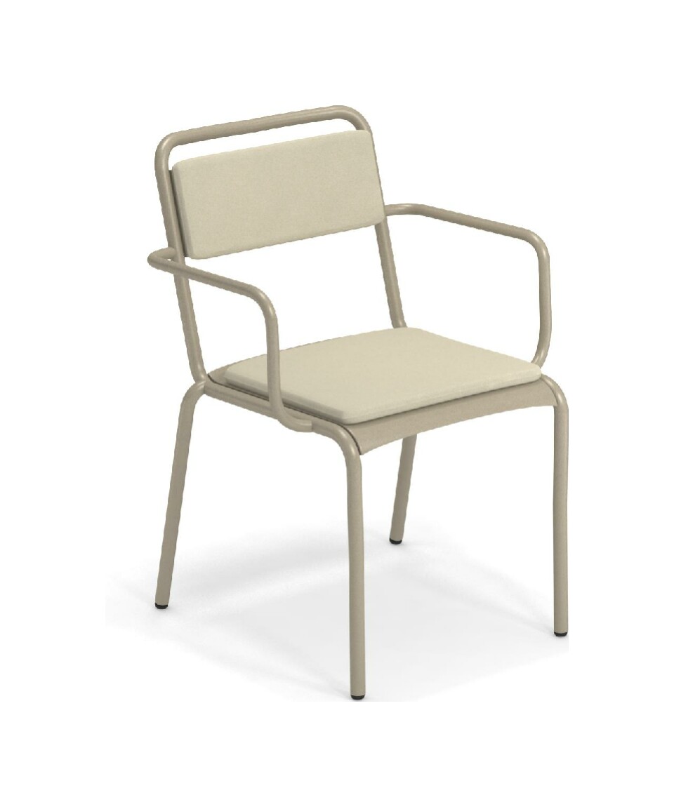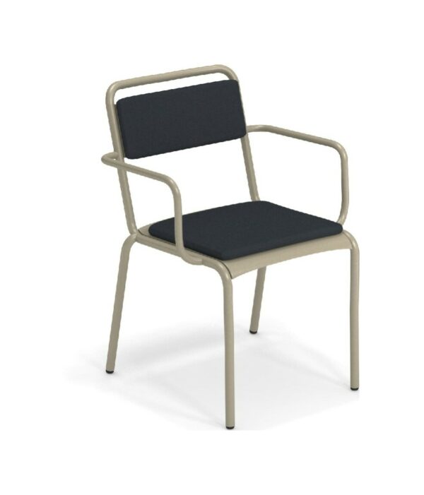 Der Stuhl ist mit oder ohne Armlehnen , optionalem Kissen erhältlich und bis zu 8 Einheiten stapelbar.