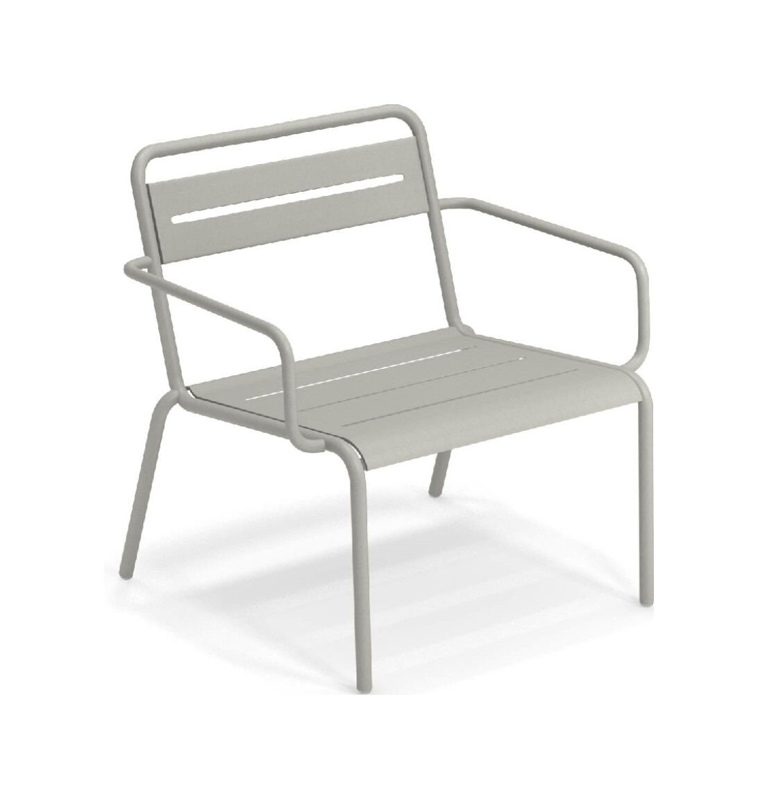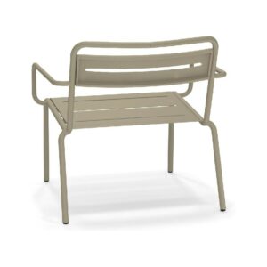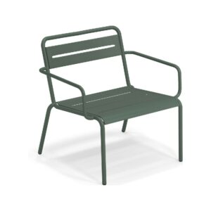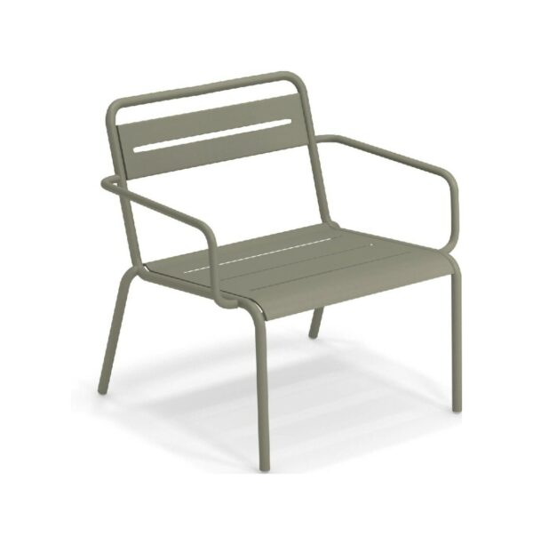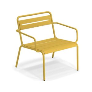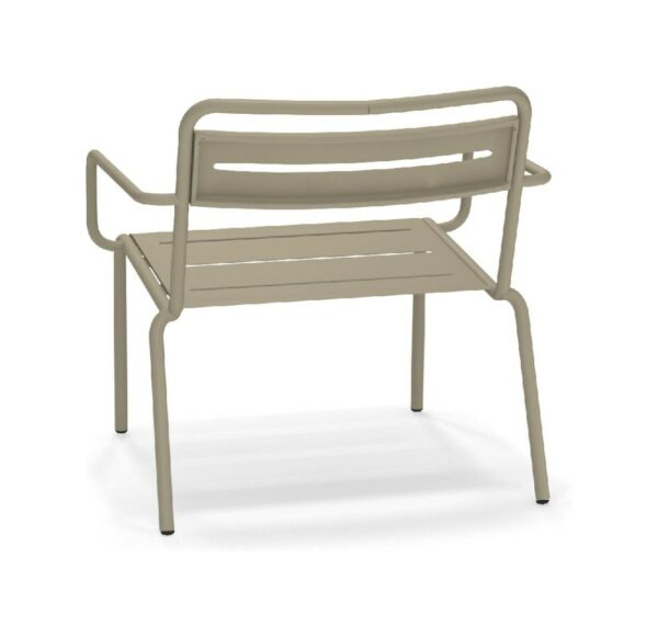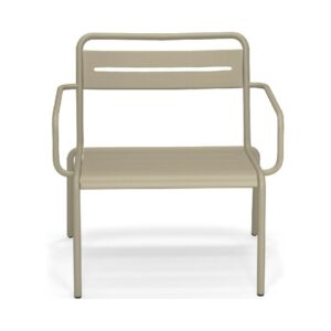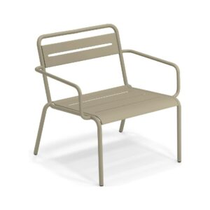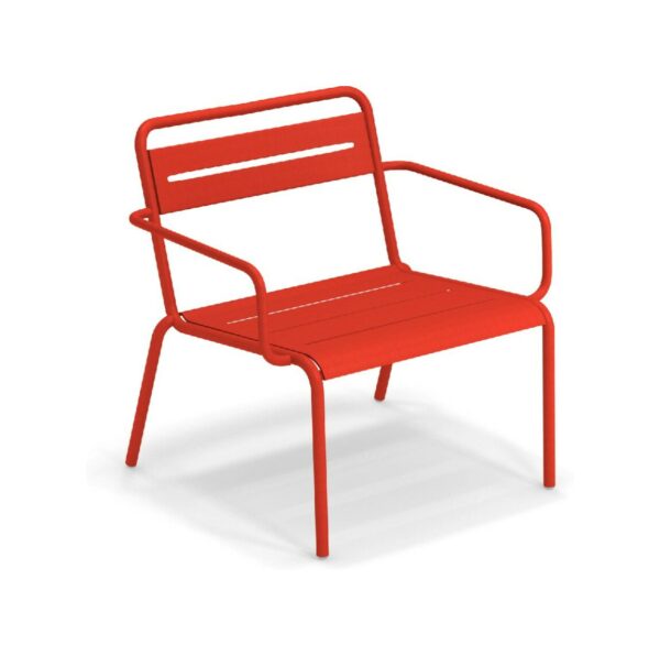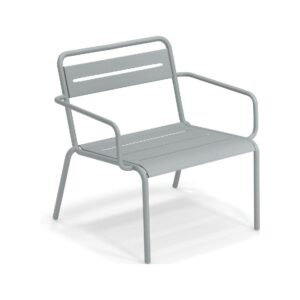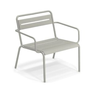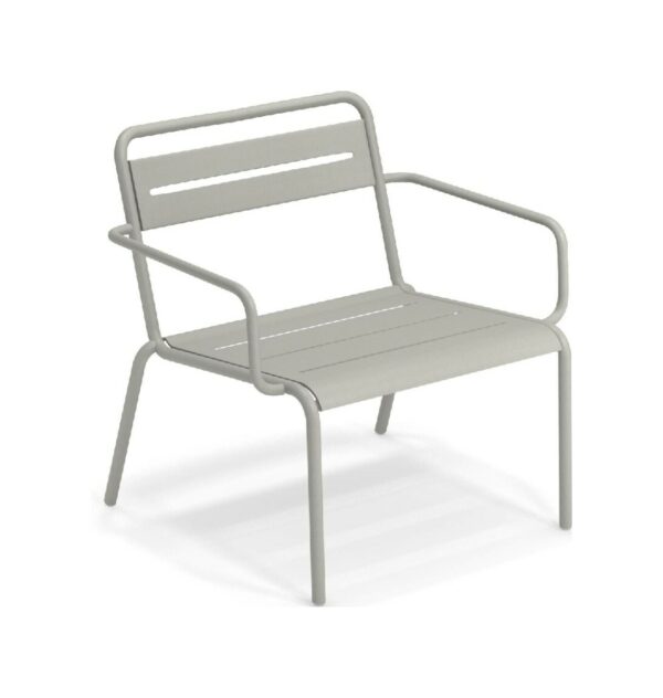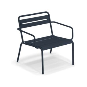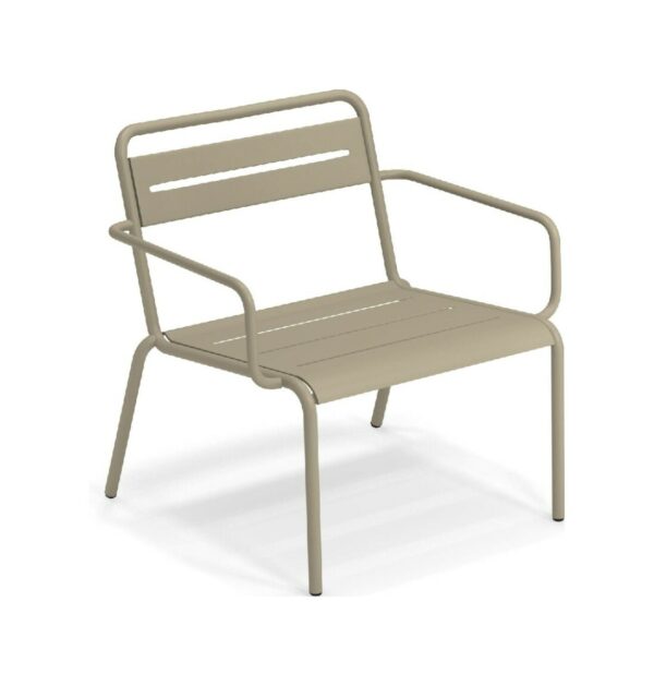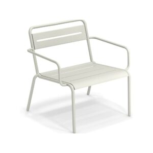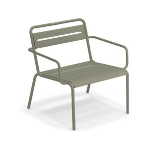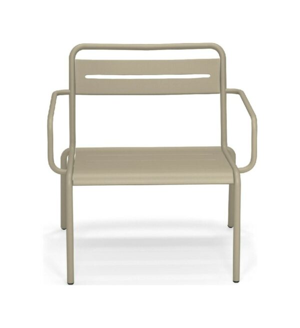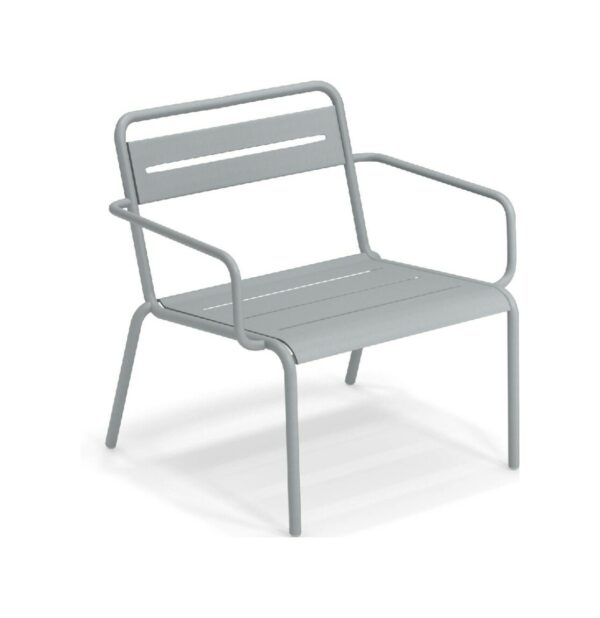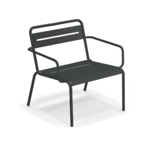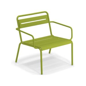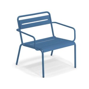 EMU STAR 1363 ist ein farbenfroher und informeller Sessel mit Armlehnen und einer bequemen und breiten Sitzfläche . Die Struktur besteht aus einer Aluminiumlegierung , die innen mit verzinkten Stahlrohren verstärkt ist . Die Formgebung erfolgt mithilfe einer Form für mehr Komfort.