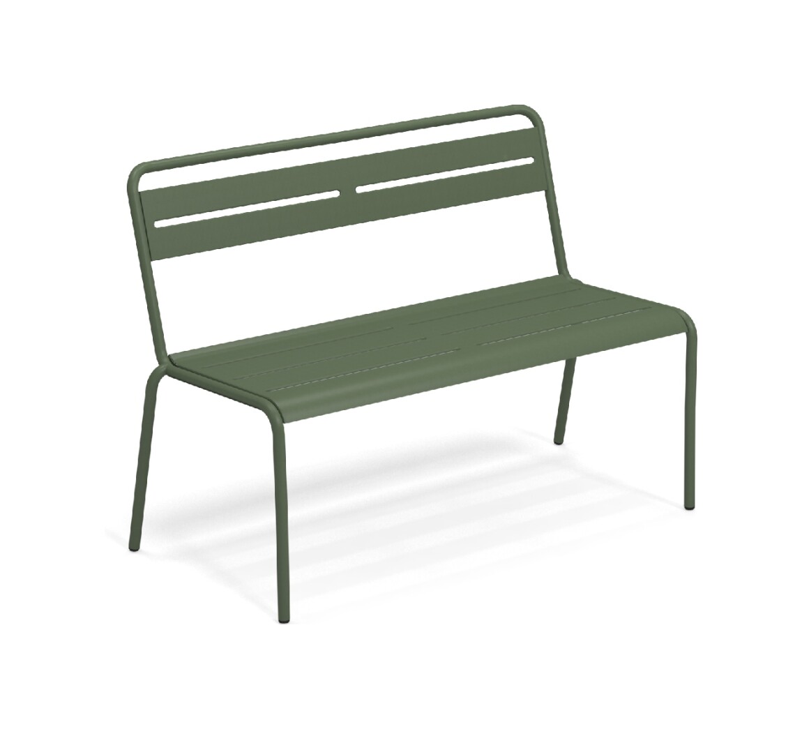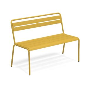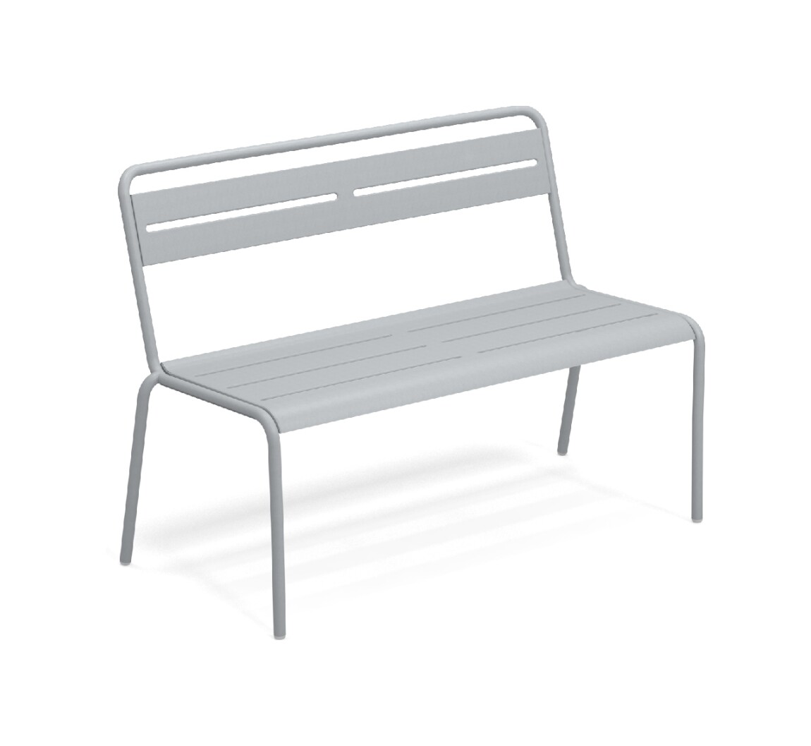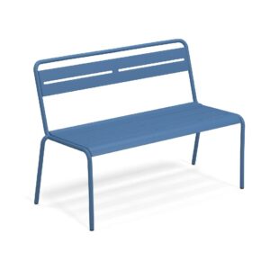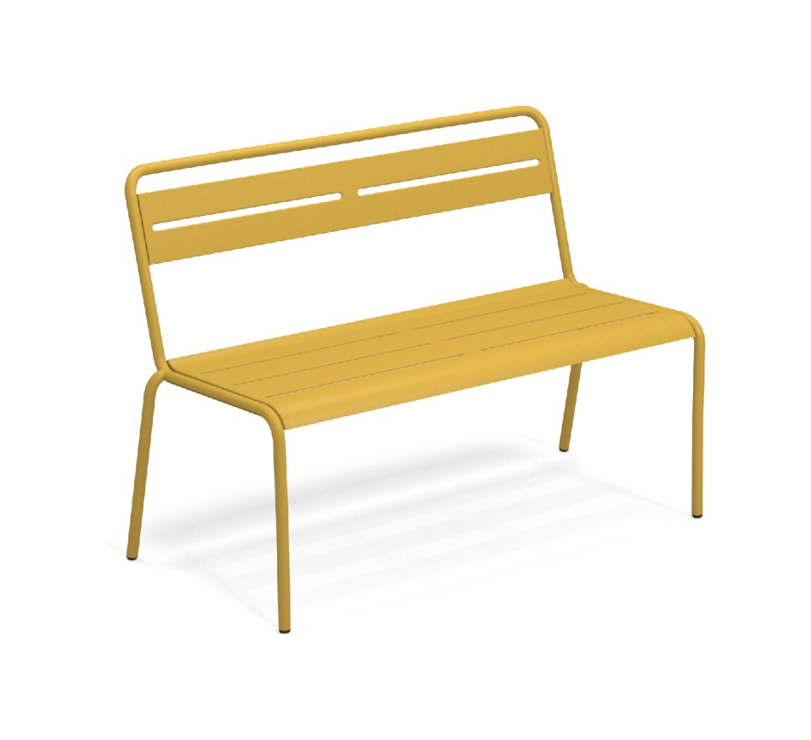 EMU STAR 163 ist eine farbenfrohe und informelle Bank Mit bequemer und breiter Sitzfläche, die Struktur besteht aus lackiertem Stahl , der Sitz und die Rückenlehne aus lackiertem, vorfeuerverzinktem Blech. Der Stahl ist durch eine Kataphorese- Oberflächenbehandlung geschützt.