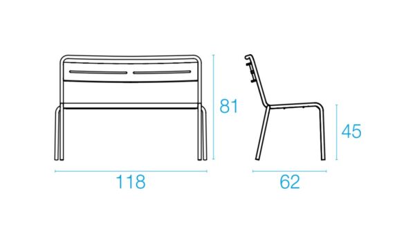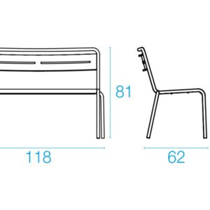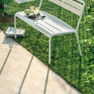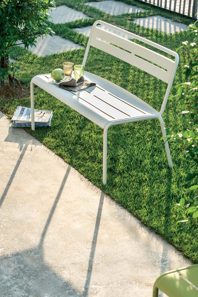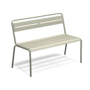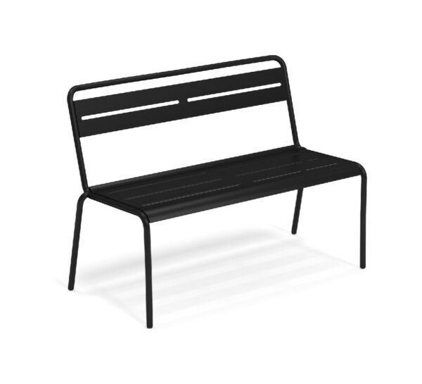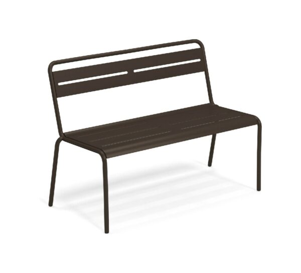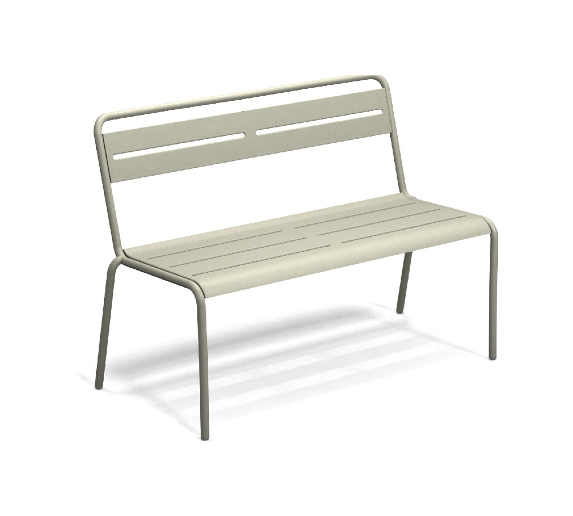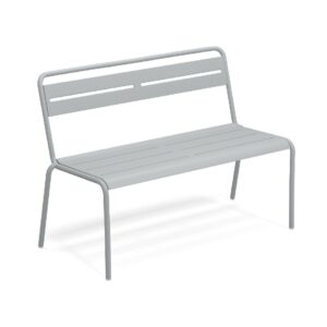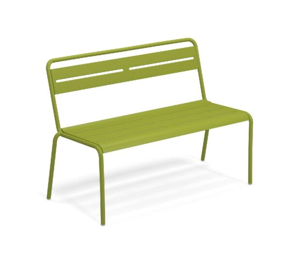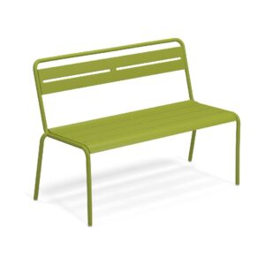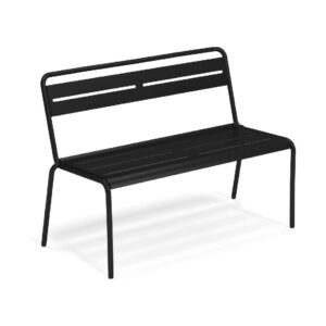EMU STAR 163 ist eine farbenfrohe und informelle Bank Mit bequemer und breiter Sitzfläche, die Struktur besteht aus lackiertem Stahl , der Sitz und die Rückenlehne aus lackiertem, vorfeuerverzinktem Blech. Der Stahl ist durch eine Kataphorese- Oberflächenbehandlung geschützt.