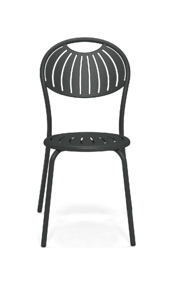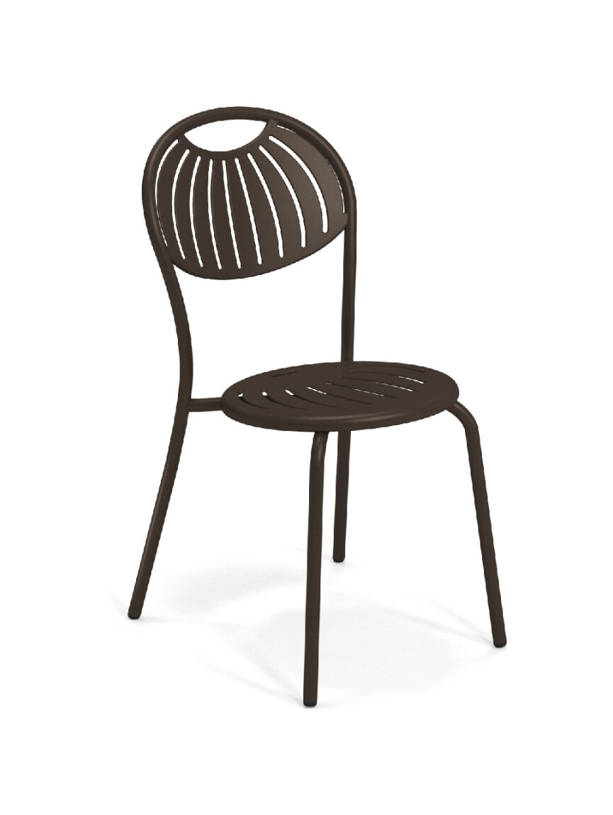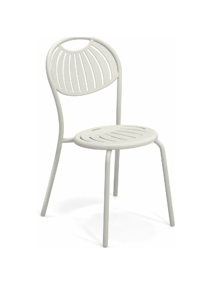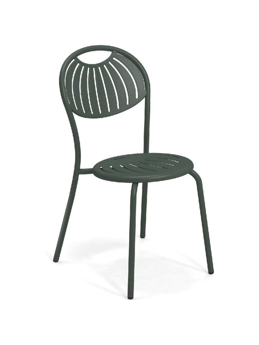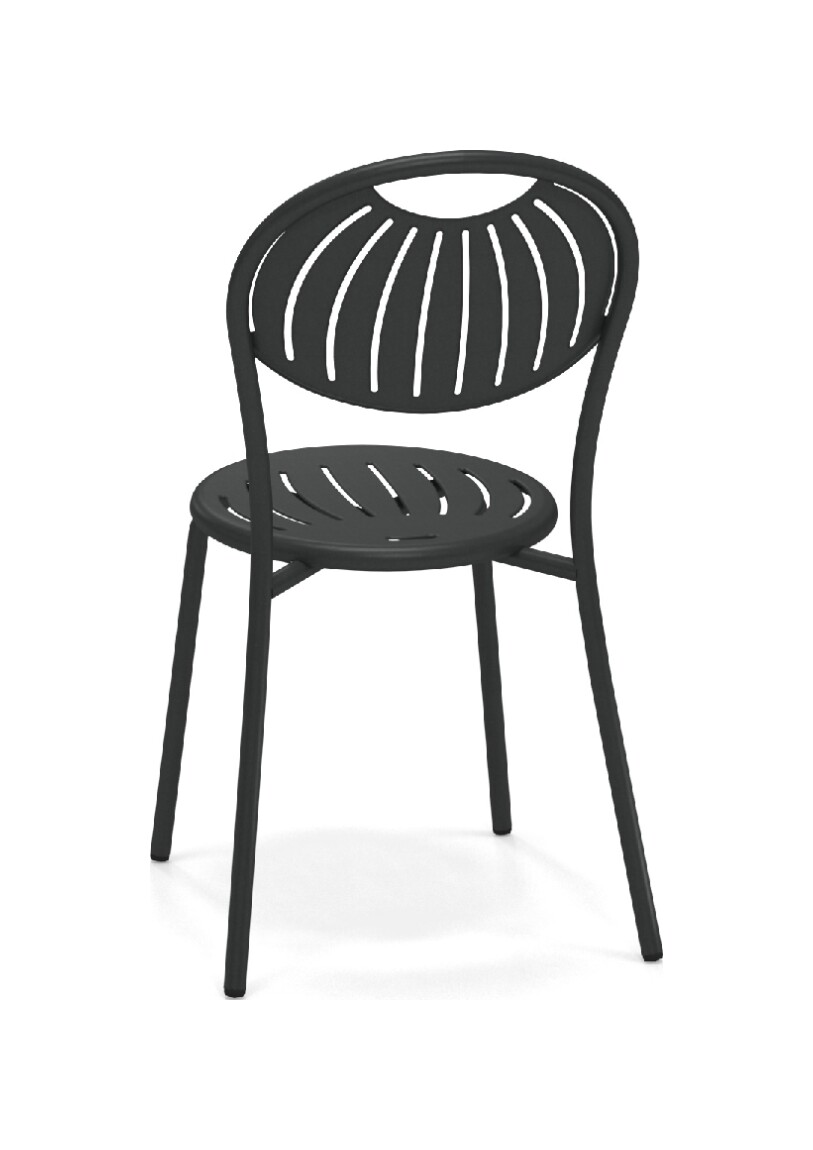 EMU COUPOLE 440 ist ein Stuhl mit lackierter Stahlstruktur , Sitz und Rückenlehne aus lackiertem, vorfeuerverzinktem Blech. Sie zeichnen sich durch ein geometrisches Muster aus Schlitzen aus, das dem Sitz ein leichtes Aussehen verleiht . Die abgerundete Rückenlehne garantiert besseren Komfort . Der Stahl ist durch eine Kataphorese- Oberflächenbehandlung geschützt .