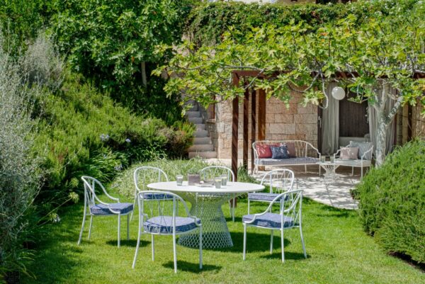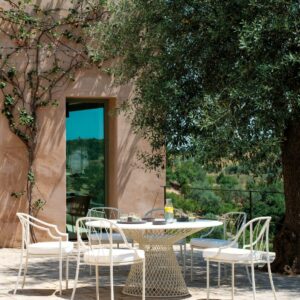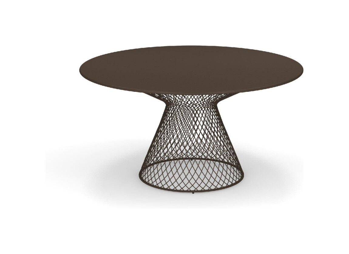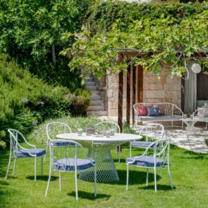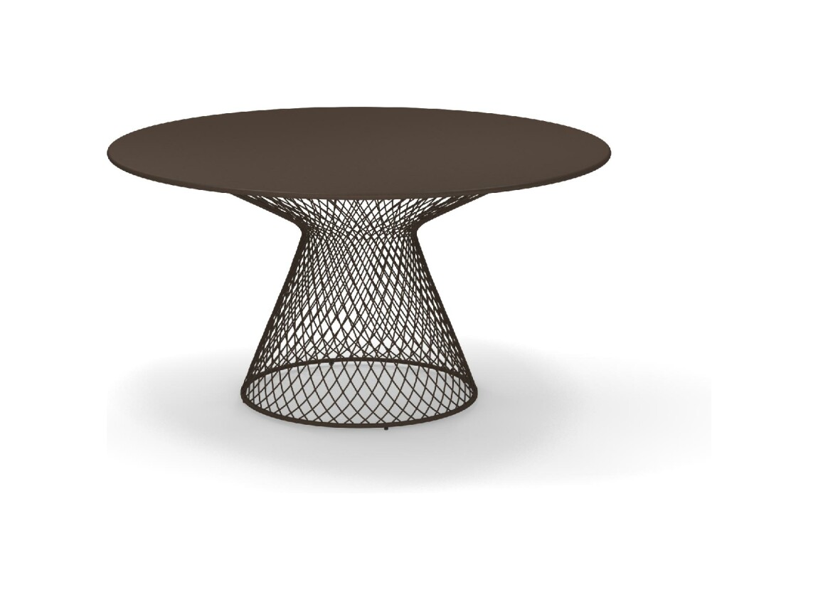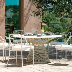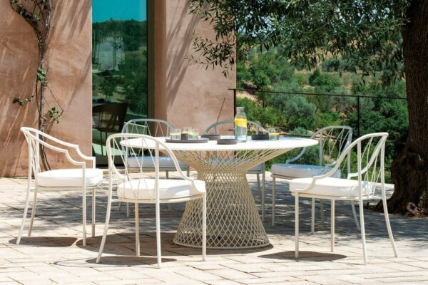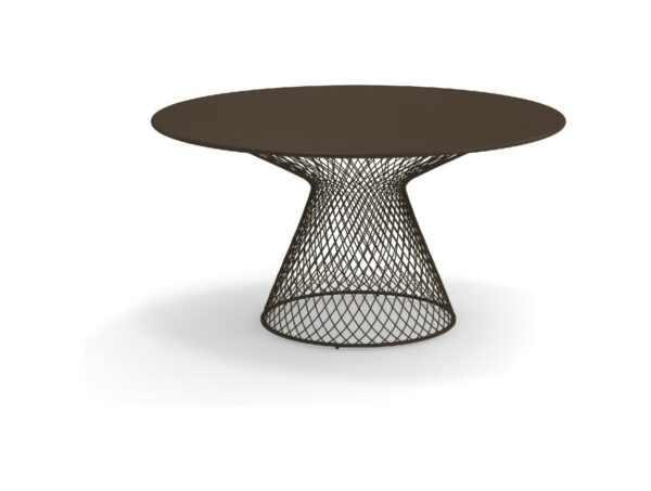 Das gewundene Netzwerk aus verzinkten Stäben des Tischgestells erinnert an klassische Formen und definiert das exklusive Design des Produkts. Die Stabstruktur wird durch Buckelschweißen hergestellt.
