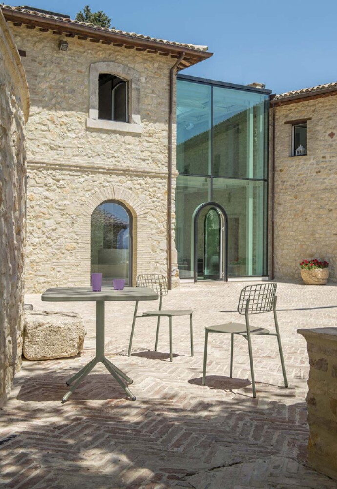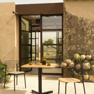 Leichtigkeit und neue Formenkombinationen inspirieren die Lyze-Kollektion von Florent Coirier, eine Linie aus Aluminium kombiniert mit Stahl. In einer ersten Version wird die Struktur von Stuhl, Sessel und Relax mit einem Aluminiumsitz und einer Rückenlehne kombiniert, die aus einem Geflecht aus Stahlstangen besteht. In der zweiten Version wird die Aluminiumstruktur mit einem Sitz aus 100 % FSC-Teakholz kombiniert, eine interessante Materialkombination, die dank einer eingehenden Untersuchung des Materialmixes erzielt wurde. Struktur und Rückenlehne werden mechanisch mit Schrauben befestigt, sodass Sie zahlreiche Farbkombinationen zwischen Sitzfläche und Rückenlehne erstellen können.