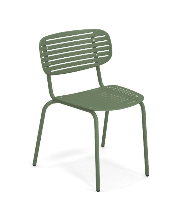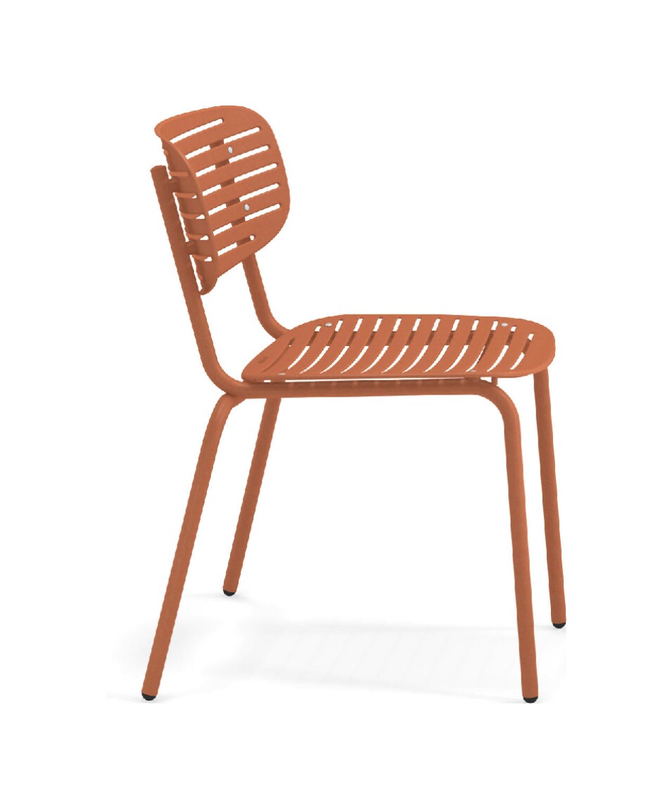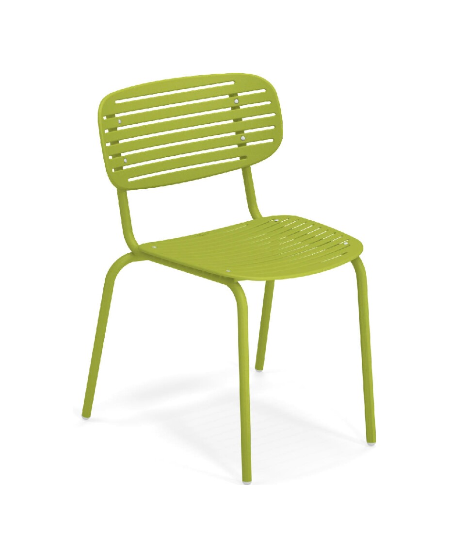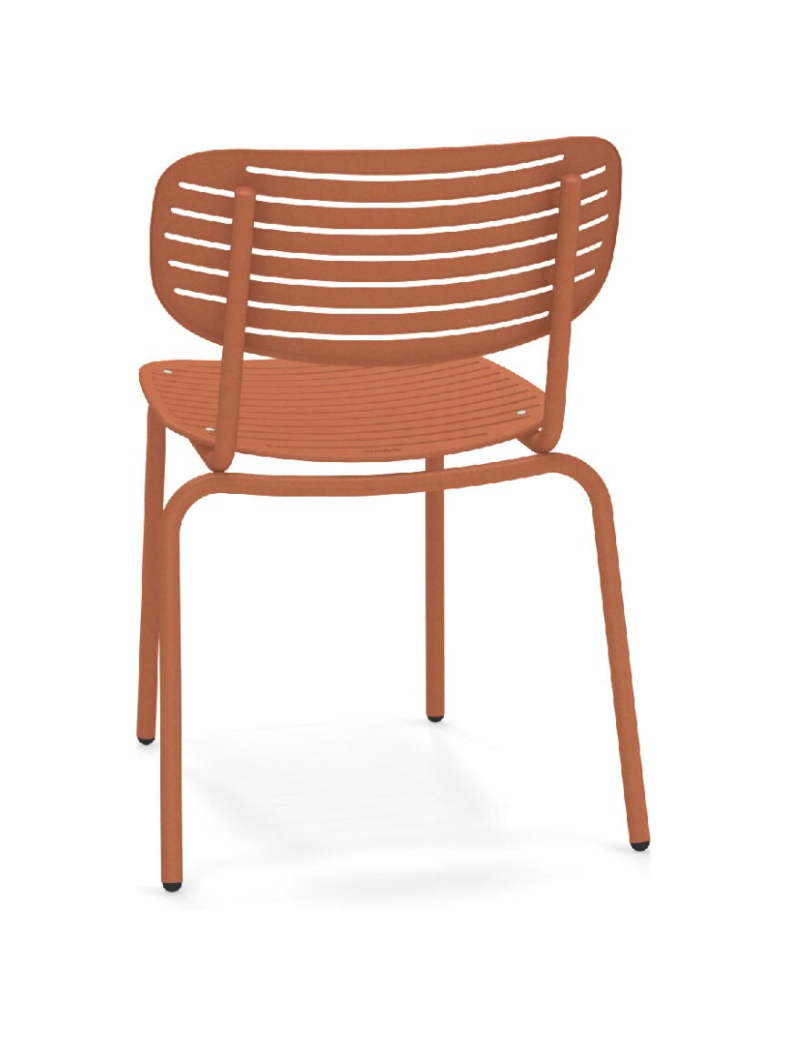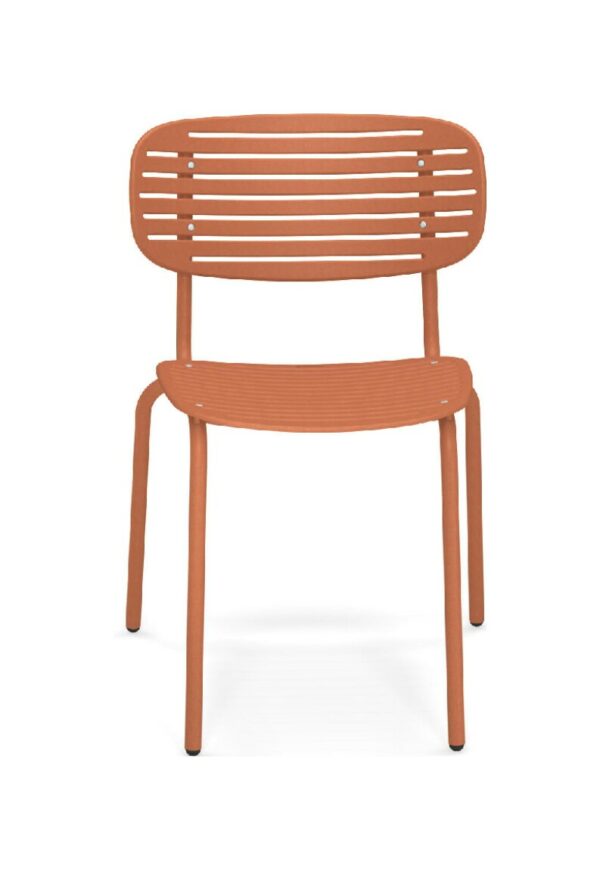 EMU MOM 639/640 ist ein Stuhl mit lackierter Stahlstruktur und Sitz und Rückenlehne aus lackiertem, vorfeuerverzinktem Blech, erhältlich in verschiedenen Farben. Die Rückenlehne wird mit Edelstahlnieten an der Struktur befestigt. Diese Nieten verringern das Risiko von Korrosion, Rost und Beschädigung durch Witterungseinflüsse. Der Stahl ist durch eine Kataphorese-Oberflächenbehandlung geschützt.