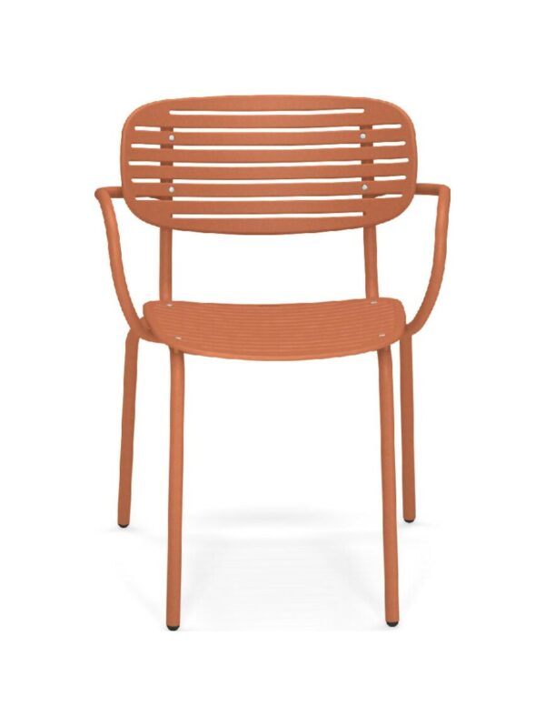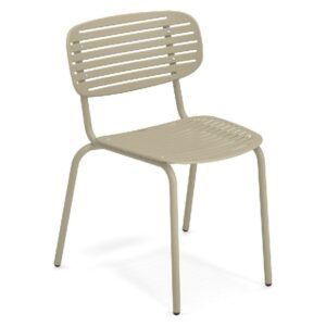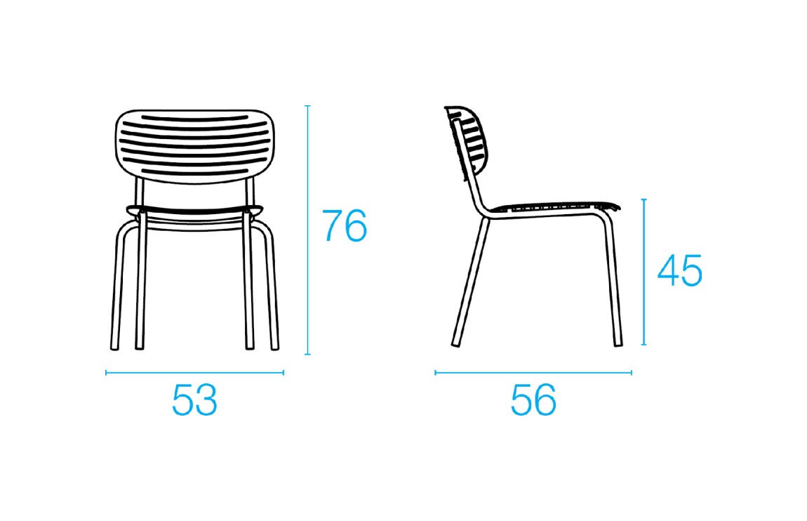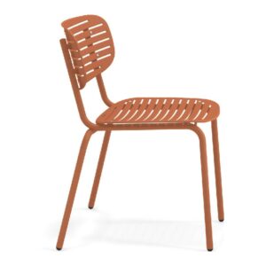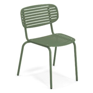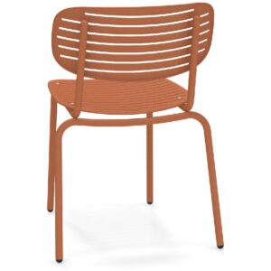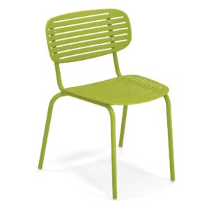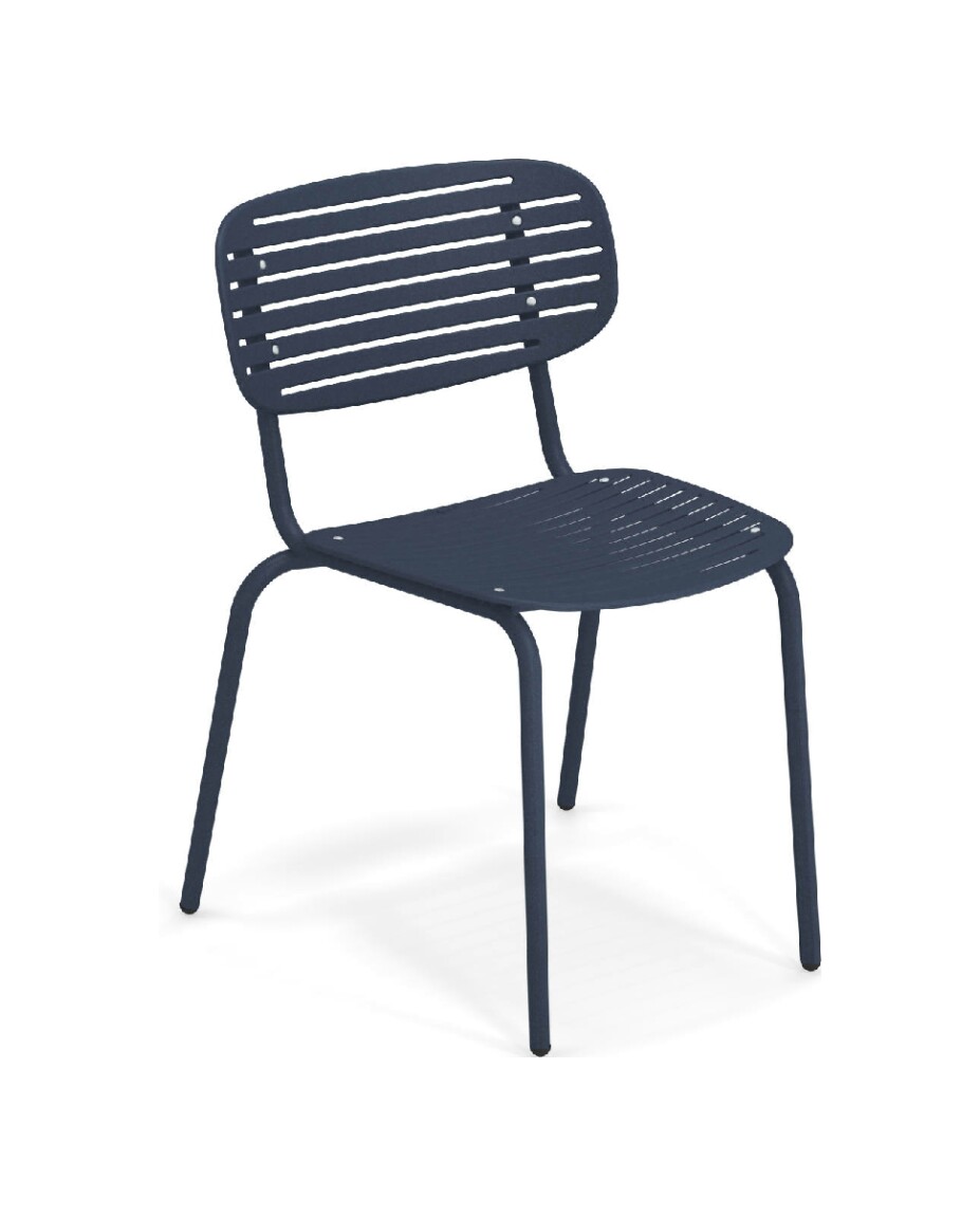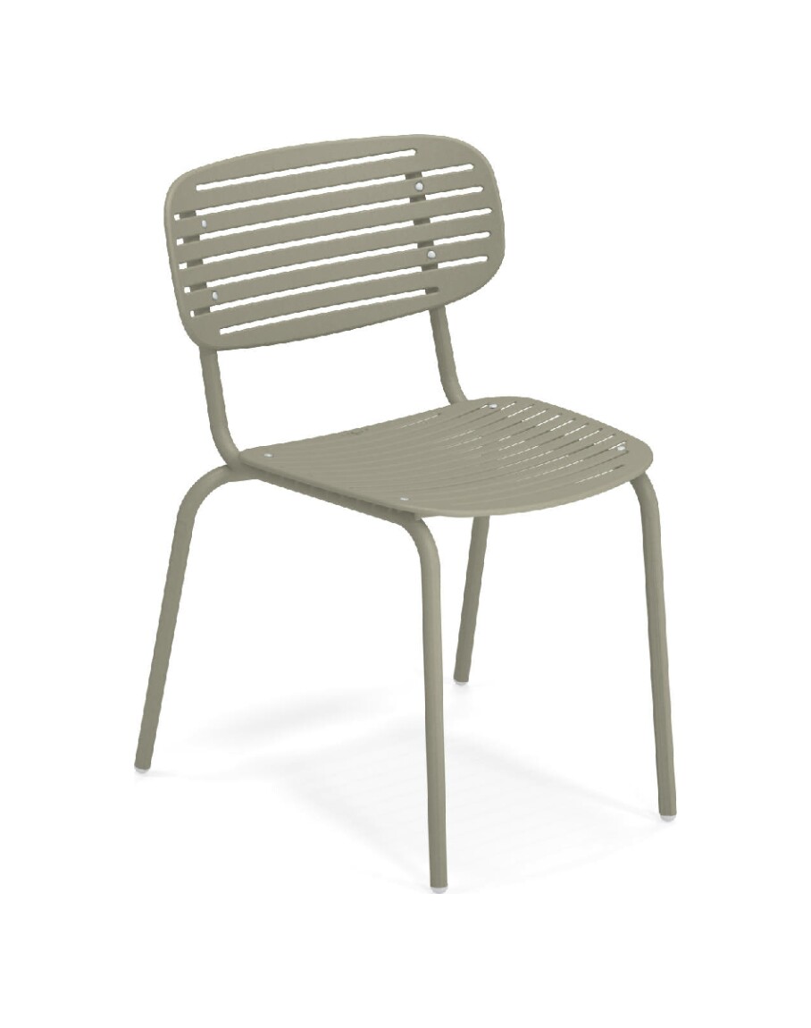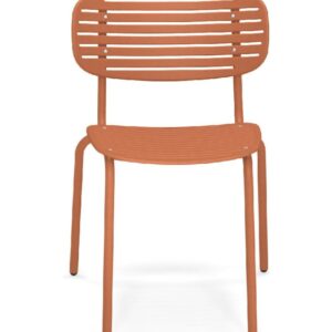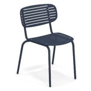 EMU MOM 639/640 ist ein Stuhl mit lackierter Stahlstruktur und Sitz und Rückenlehne aus lackiertem, vorfeuerverzinktem Blech, erhältlich in verschiedenen Farben. Die Rückenlehne wird mit Edelstahlnieten an der Struktur befestigt. Diese Nieten verringern das Risiko von Korrosion, Rost und Beschädigung durch Witterungseinflüsse. Der Stahl ist durch eine Kataphorese-Oberflächenbehandlung geschützt.