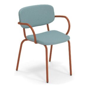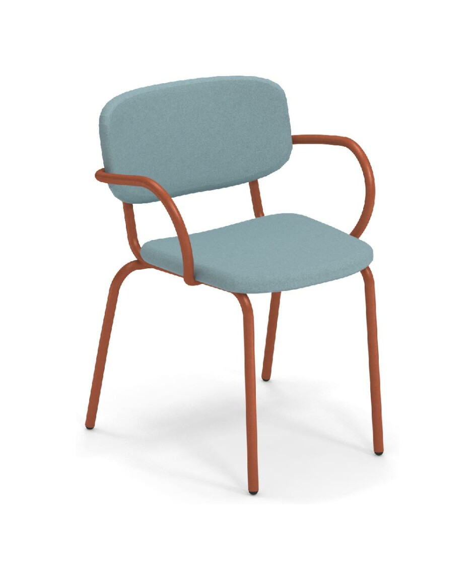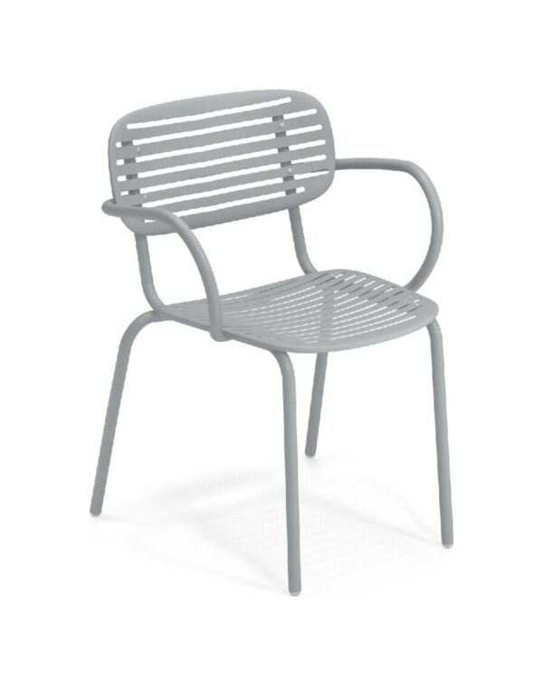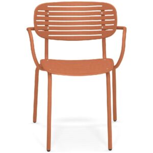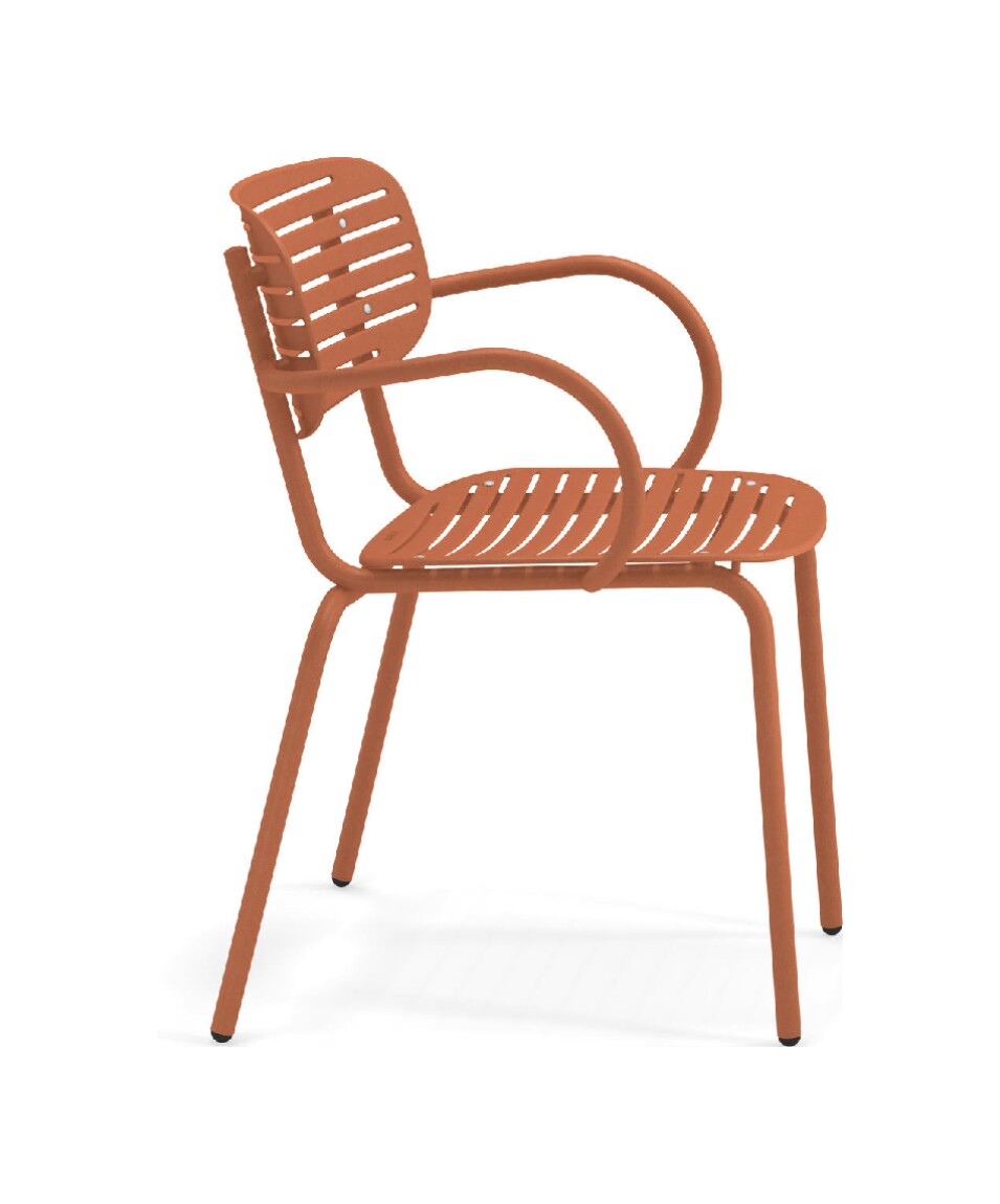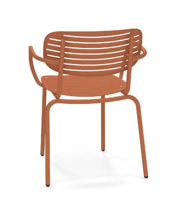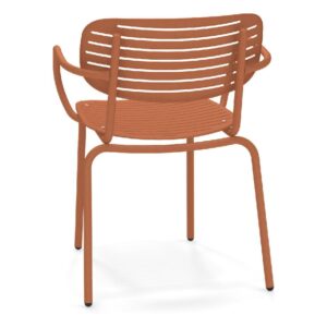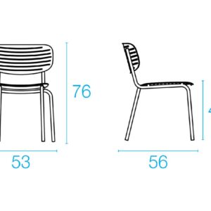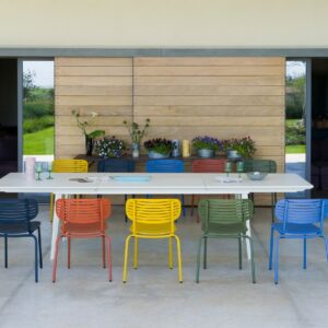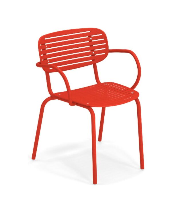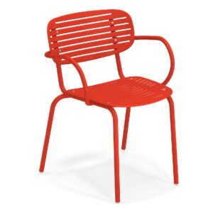 EMU MOM 639/640 ist ein Stuhl mit lackierter Stahlstruktur und Sitz und Rückenlehne aus lackiertem, vorfeuerverzinktem Blech, erhältlich in verschiedenen Farben. Die Rückenlehne wird mit Edelstahlnieten an der Struktur befestigt. Diese Nieten verringern das Risiko von Korrosion, Rost und Beschädigung durch Witterungseinflüsse. Der Stahl ist durch eine Kataphorese-Oberflächenbehandlung geschützt.