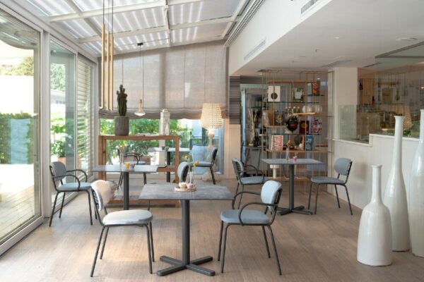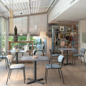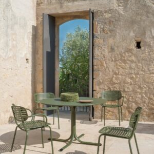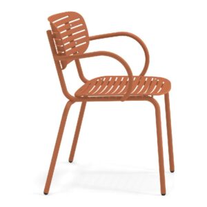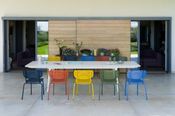 Die Mom-Kollektion von Coirier ist von traditionellen japanischen Tabletts inspiriert. Die Struktur besteht vollständig aus Fe360-Stahlrohr, während Sitz und Rückenlehne, die sich durch das besondere grafische Design auszeichnen, aus gezogenem verzinktem Stahlblech bestehen. Emu-Coat-Finish (Kataphorese + Lackierung).