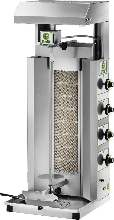 Der Gaskreisel GYR80M von Fimar wird zum Garen von Fleisch für Kebabs verwendet. Die Struktur, die Spießstange und die Fleischschaufel aus Edelstahl. Die Brenner sind Infrarot mit Keramikplatte. Der Kreisel ist mit einem abnehmbaren Sicherheitsnetz für die Brenner ausgestattet.