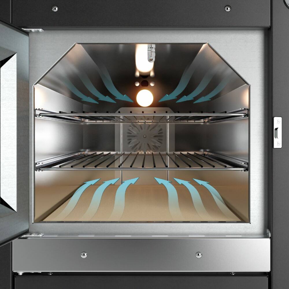 CLEVER ist ein völlig erneuertes Belüftungssystem, das es Ihnen ermöglicht, in 25 Minuten (*) 250 °C zu erreichen und dabei nur 1,5 kg Holz zu verwenden, was positiv auf Energieeinsparungs- und Effizienzanforderungen reagiert. Der an der Rückwand des Ofens angebrachte Ventilator ermöglicht das Absaugen der von den Speisen erzeugten Dämpfe und entfernt so jegliche Feuchtigkeit aus dem Garraum. Gleichzeitig durchläuft die Wärme, die direkt von der Brennkammer zum Boden des Garraums gelangt , dank der vom Ventilator ausgeübten Kraft einen obligatorischen Drehweg. Dadurch wird die Wärme vom hinteren Teil des Ofens nach vorne gedrückt, wo sie an dieser Stelle durch kleine Löcher an der Vorderseite entweicht: Dies ermöglicht nicht nur ein perfekt homogenes Garen, sondern vermeidet auch den plötzlichen Wärmeaustritt beim Öffnen des Ofens, wodurch ein… Luftbarriere. *Temperatur und Zeiten beziehen sich auf einen 45×80-Ofen.
