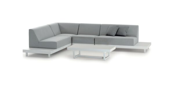 Eine Komposition bestehend aus zwei Sofas, einem linearen Modul, einem Eckmodul und einem Couchtisch .