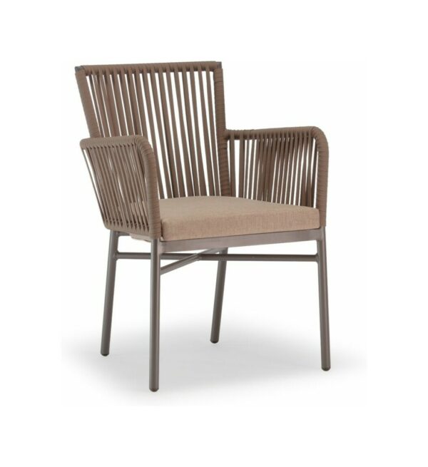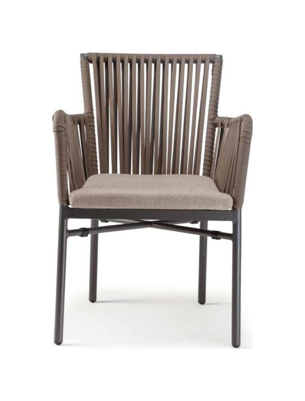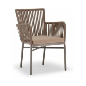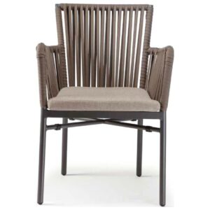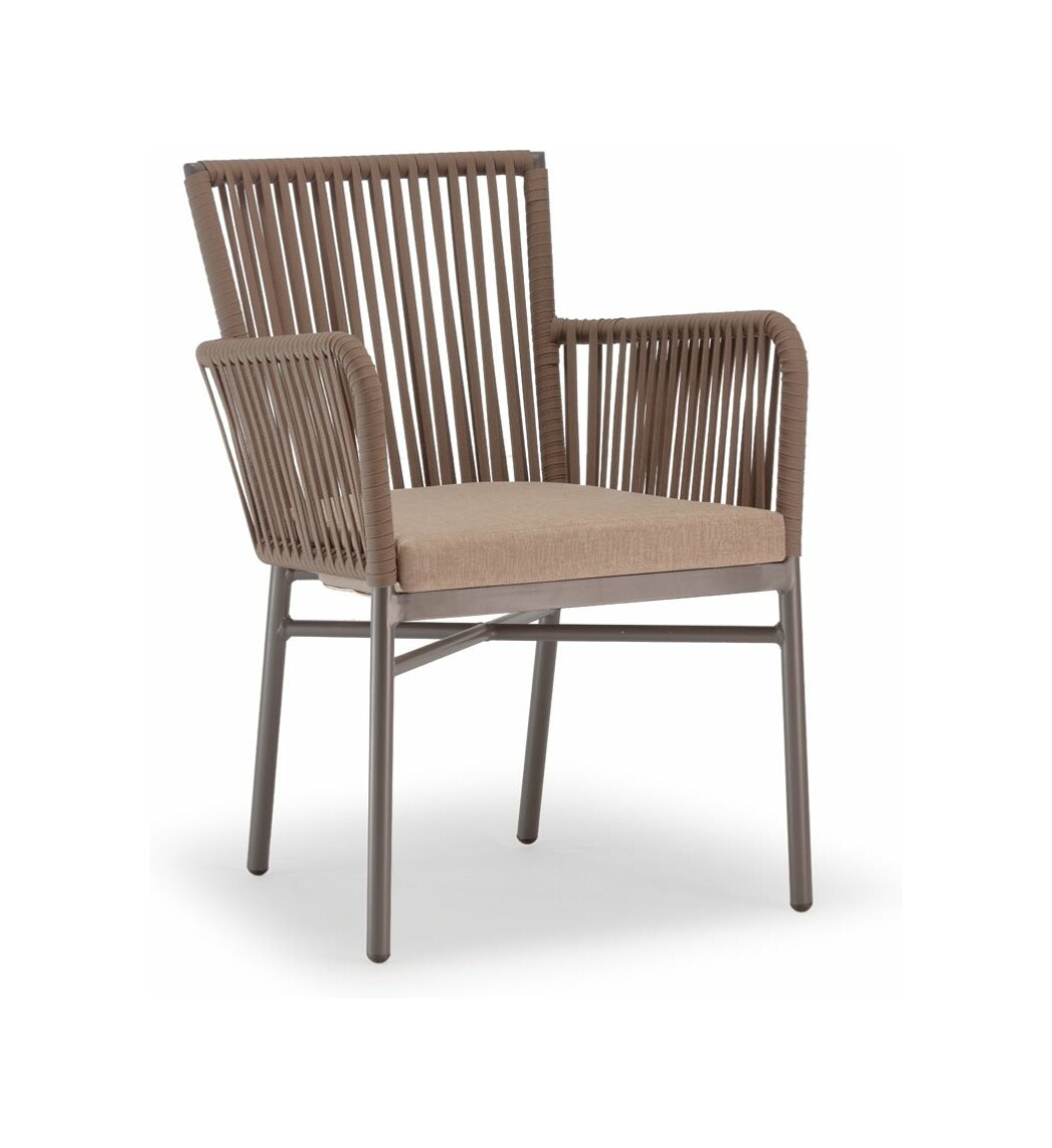Die anthrazitfarben lackierte Aluminiumstruktur ist mit taupefarbenem Textilene, „Seileffekt“ und Ökogeflecht überzogen und wird durch ein bequemes Kissen mit abnehmbarem Bezug aus braunem Acrylstoff ergänzt.
