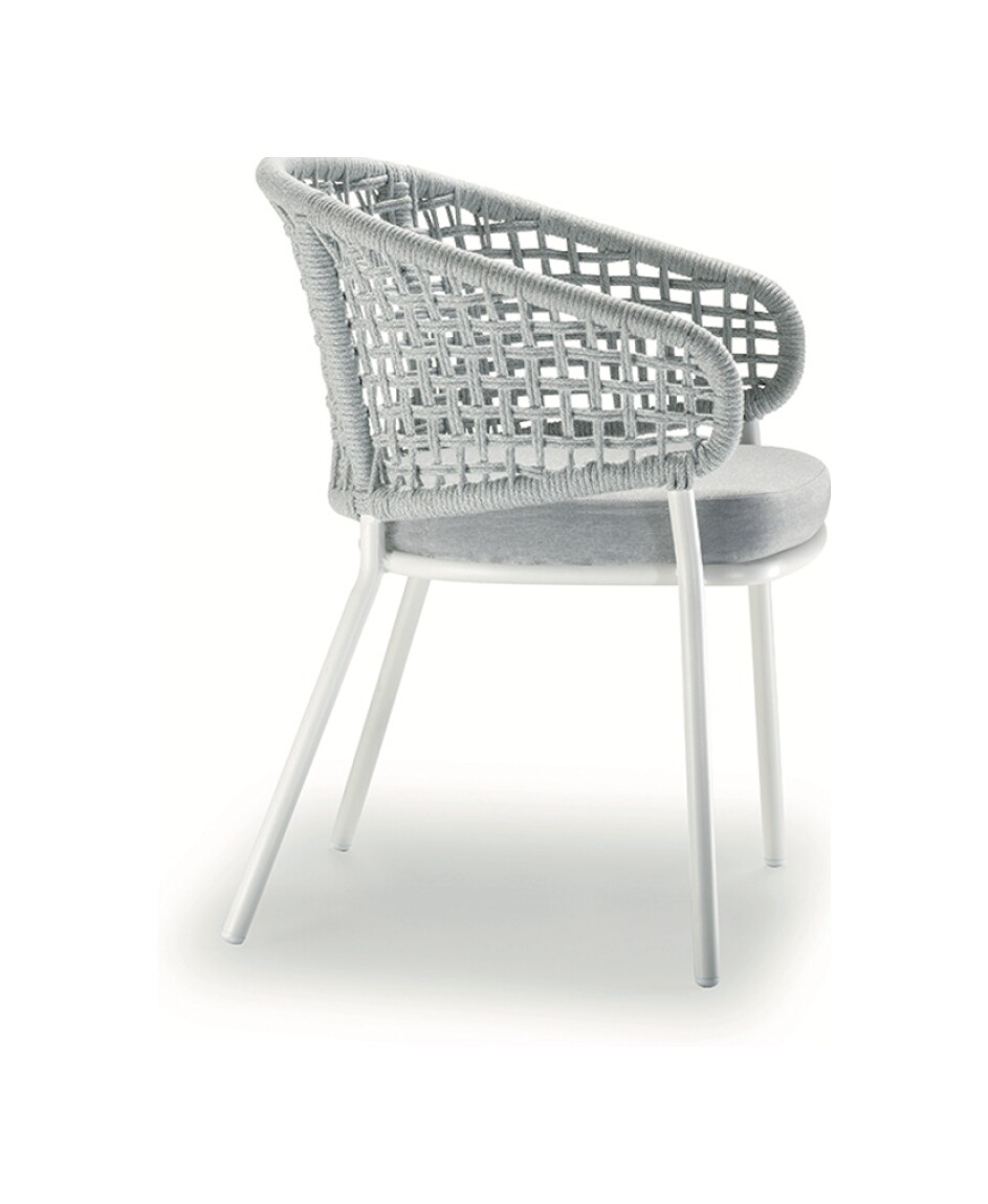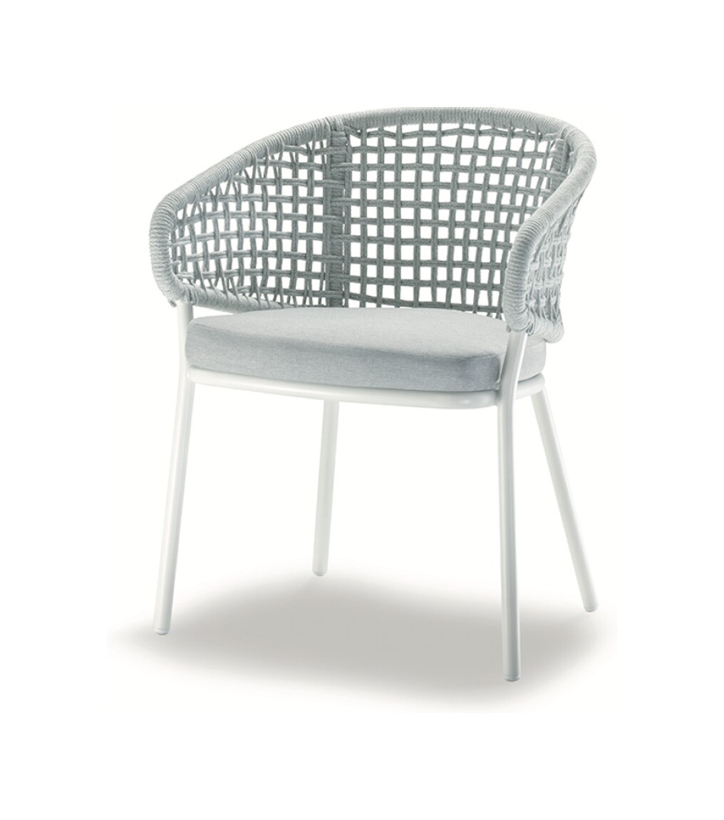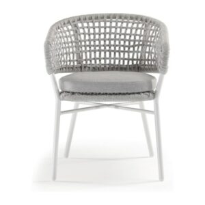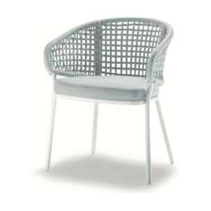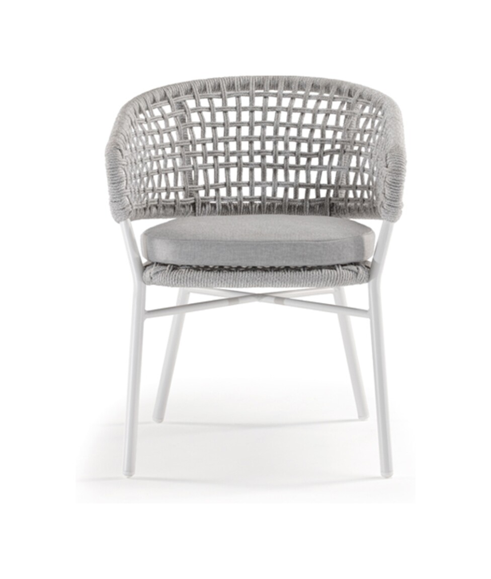 Die weiße Aluminiumstruktur ist mit hellgrauem Acrylseil bezogen und wird durch ein bequemes Kissen mit abnehmbarem Bezug aus Olefinstoff vervollständigt.