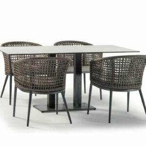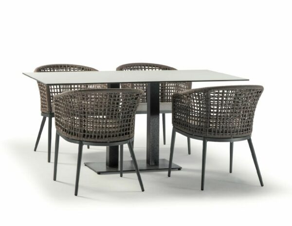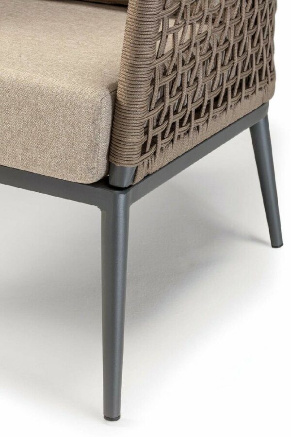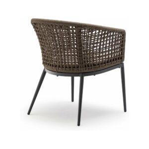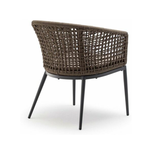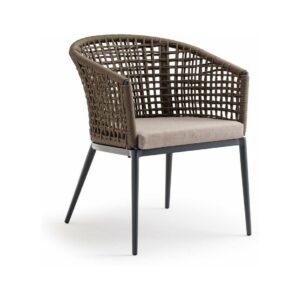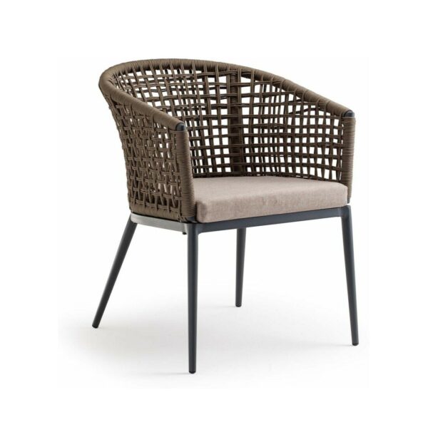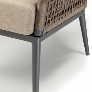 Die Struktur besteht aus anthrazitfarben lackiertem Aluminium, das mit einem braunen Polyesterseil mit 4 mm Durchmesser überzogen ist. Der Sitz wird dank eines abnehmbaren Kissens aus Acrylgewebe noch bequemer.