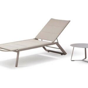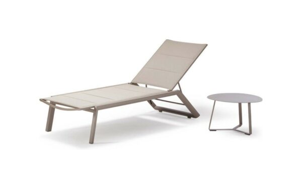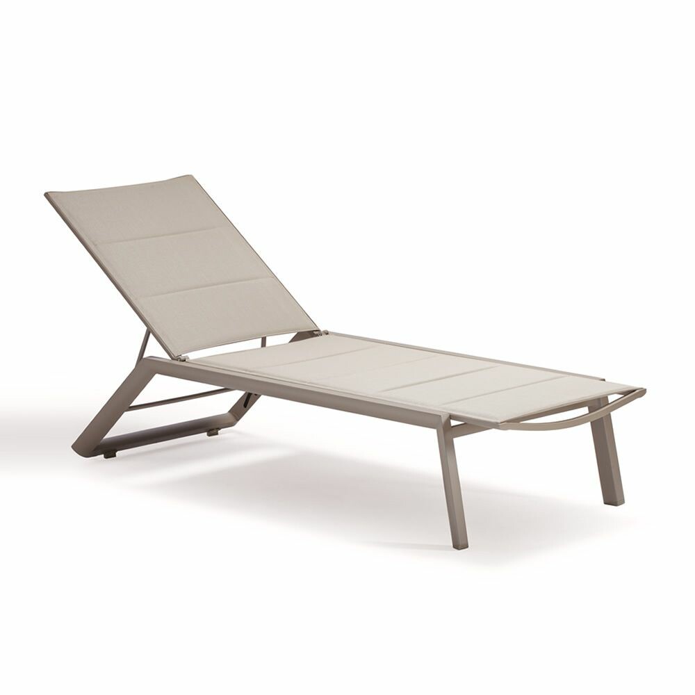 Die Struktur besteht aus taupefarbenem Aluminium, während die Rückenlehne und der Sitz mit Textilene und Schaumstoff gepolstert sind.