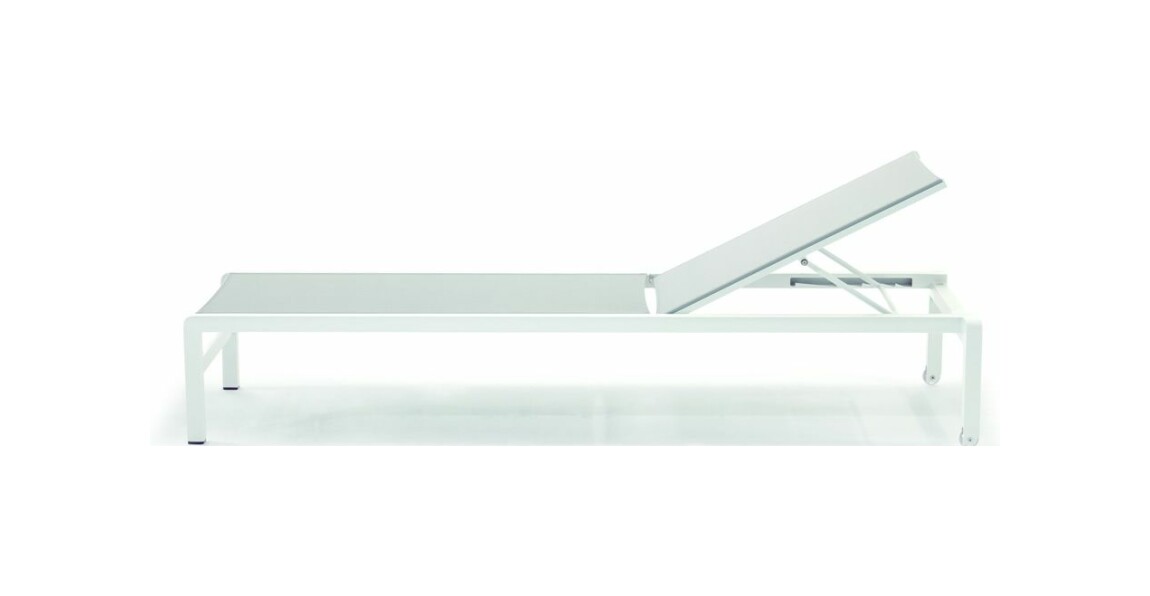 Die Struktur ist aus weiß lackiertem Aluminium, während die Rückenlehne und der Sitz aus 2 mm starkem Textilene sind, ebenfalls in Weiß.