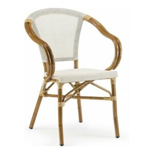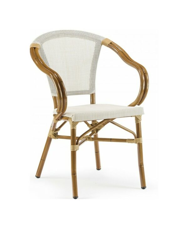 Die Struktur besteht aus mit Bambuseffekt lackiertem Aluminium, während Sitz und Rückenlehne aus beigefarbenem Textilene bestehen.