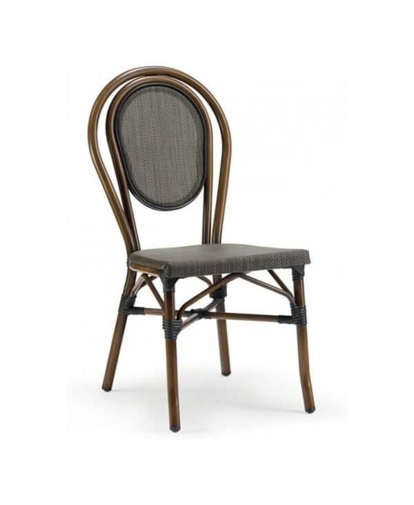 Die Struktur besteht aus lackiertem Aluminium mit Holzeffekt, während Sitz und Rückenlehne aus braunem Textilene sind.