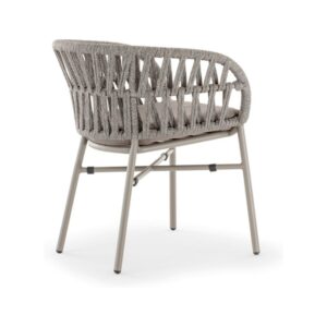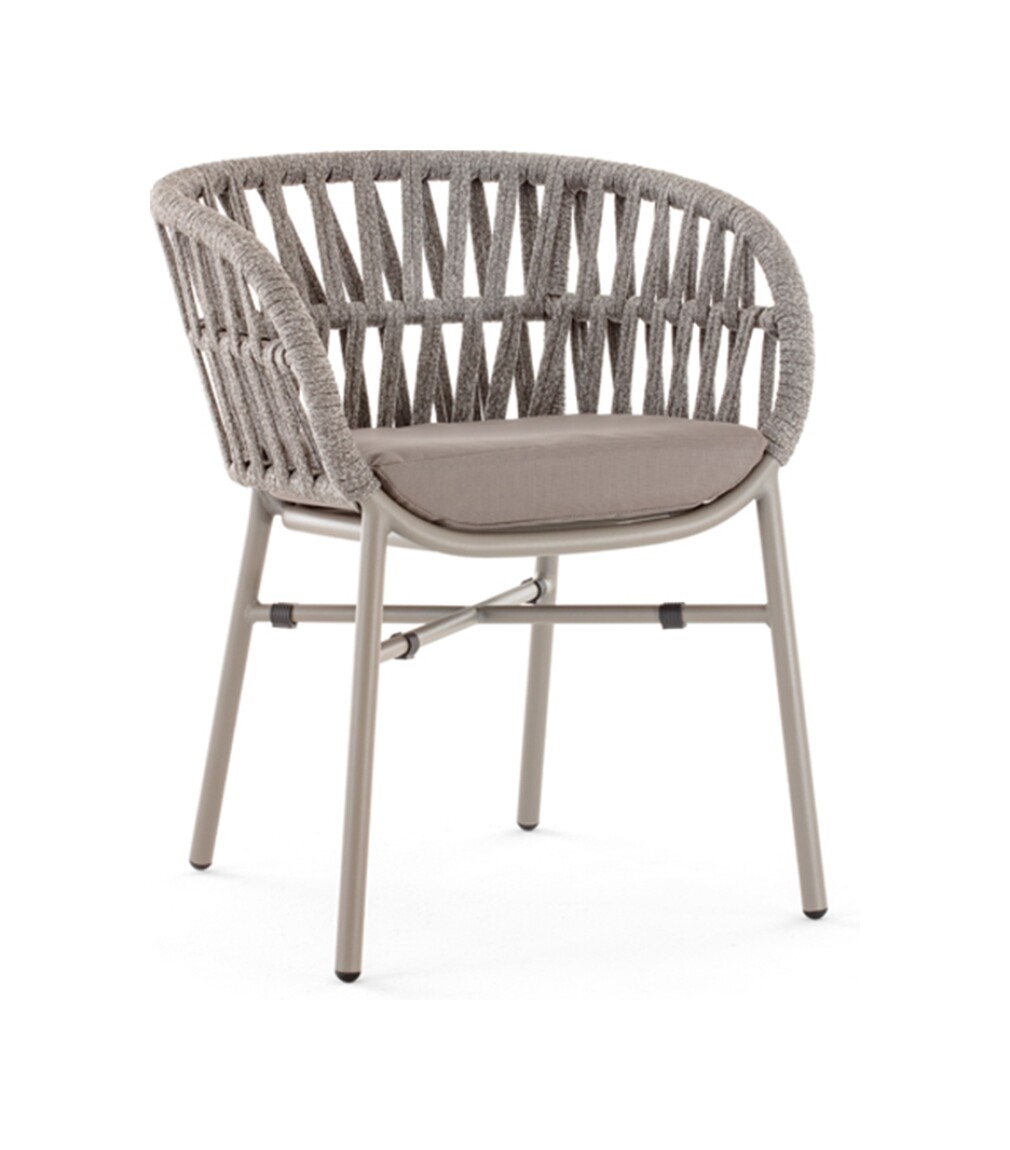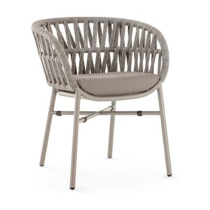 Die taupefarbene Aluminiumstruktur ist mit silbergrauem Polyolefinstoff bezogen und wird durch ein bequemes Kissen aus taupefarbenem Textilenestoff ergänzt.