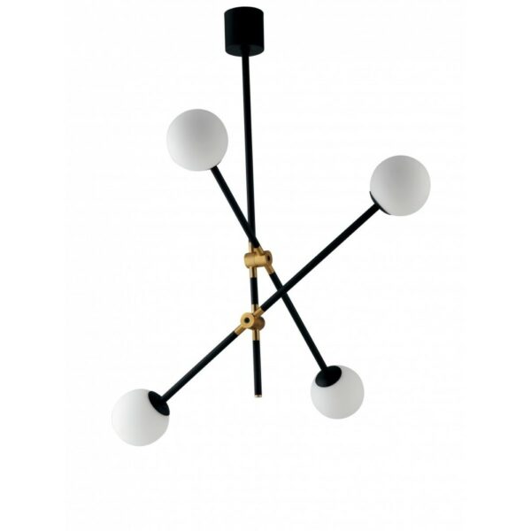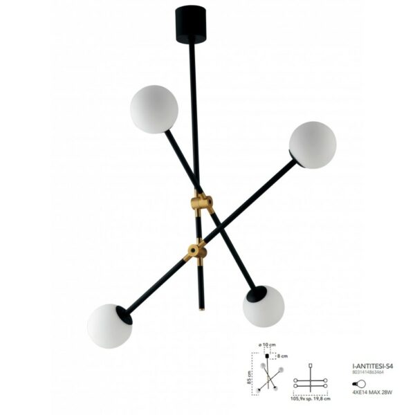 I-antitesi-S4 von antitesi Sammlung von Ambient Light Design ist eine schwarzes Hängelampe aus Metall und gebürstetem Gold mit opal geblasenem Glas Diffusoren.