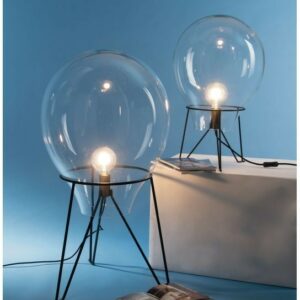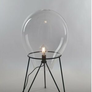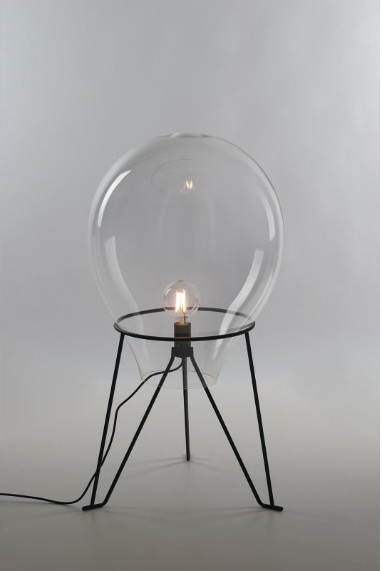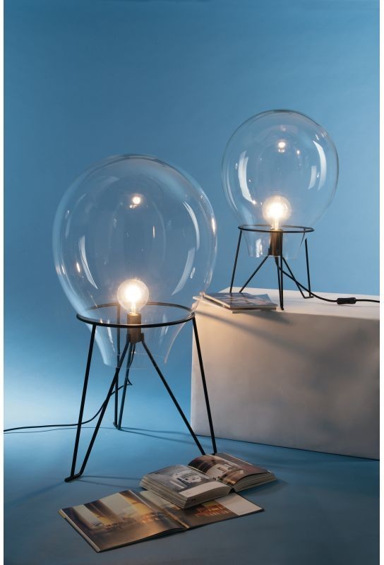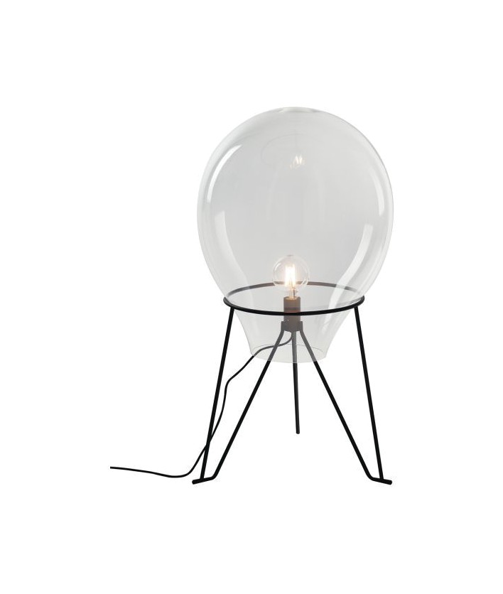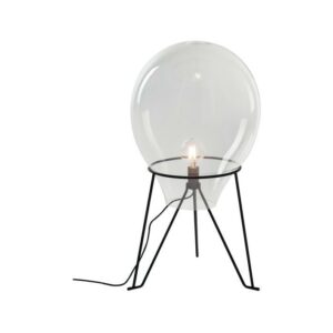 I-AZUMA-L35 aus der Azuma- Kollektion von Luce Ambiente Design ist eine Tischlampe aus transparentem mundgeblasenem Glas mit einer satinschwarzen Metallstruktur .