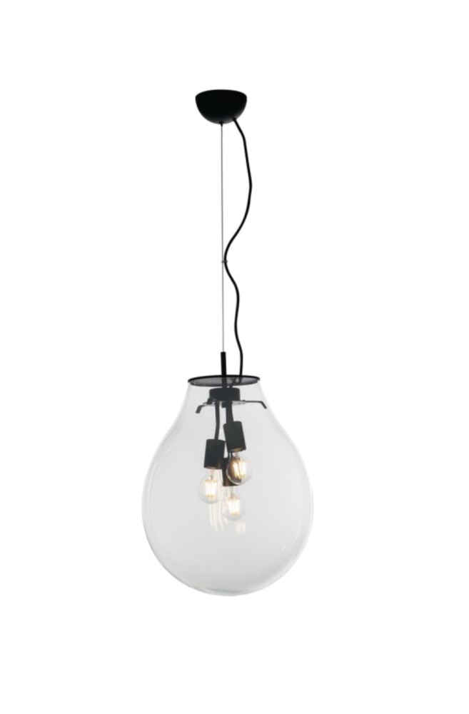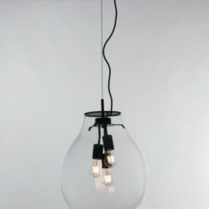 I-AZUMA-S38 aus der Kollektion von Azuma Luce Ambiente Design ist eine Pendelleuchte in transparentem geblasenen Glas mit einer mattschwarzen Metallstruktur.