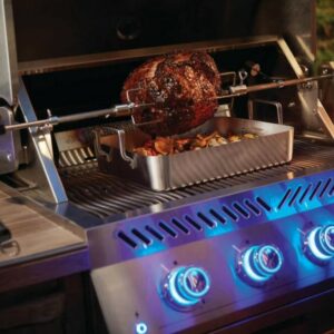 Der integrierte 32-Zoll-Gasgrill BIG32 verfügt über einen Infrarot-Heckbrenner und wird mit einem handelsüblichen Rotisserie-Set für perfekte Mahlzeiten am Spieß geliefert. Bewahren Sie Ihr Rotisserie-Set einfach und sicher im integrierten Rotisserie-Fach unter dem Grill auf.