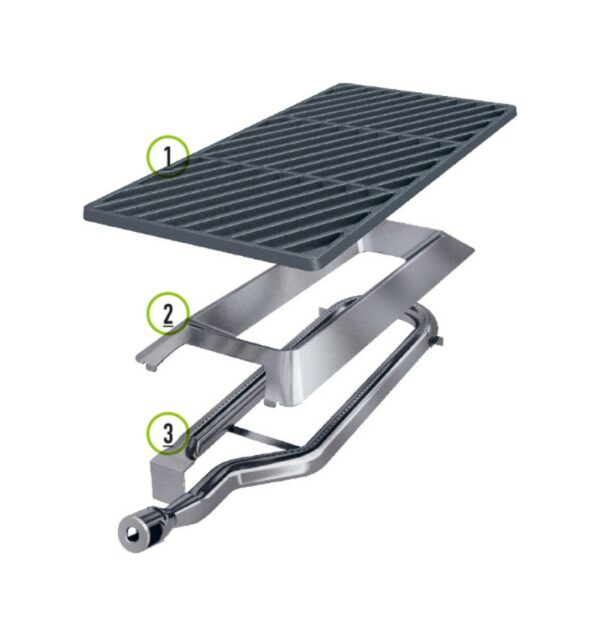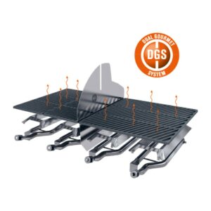 Entwickelt für eine perfekte Wärmeverteilung und Reduzierung von Aufflammen während des Kochens. Die spezielle Form dieser Stäbe lässt die Hitze von vorne aufsteigen und den vorderen Teil des Grillrosts erhitzen, der traditionell der kälteste und unbrauchbarste Teil bei Grills von Mitbewerbern ist.