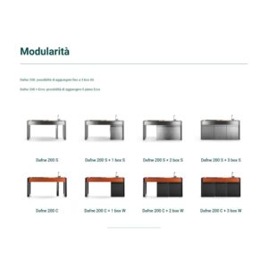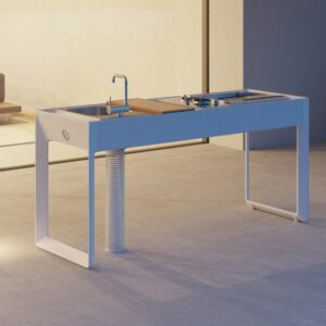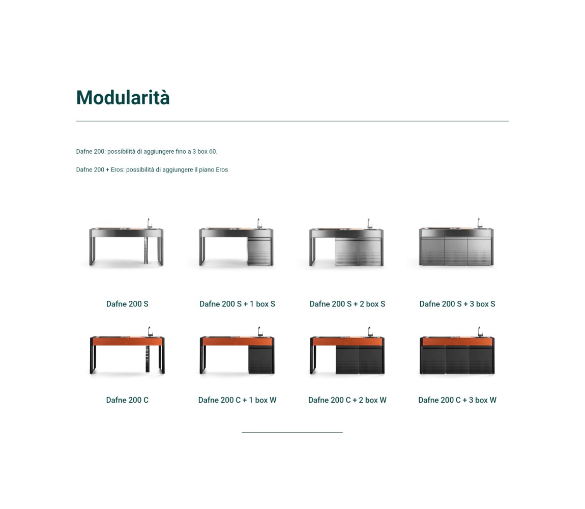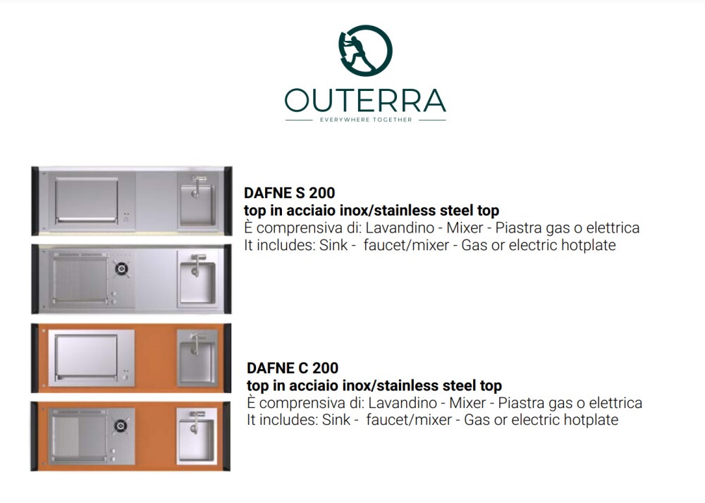 Küche mit Aluminiumstruktur, mit Edelstahl- oder UHPC-Platte. Dafne ist mit Gas- oder Elektroantrieb erhältlich. Die Küche kann mit einem Kochfeld mit Herd und Gasplatte oder einer elektrischen Teppanyaki-Platte und Spüle ausgestattet werden. Wie alle Outra-Küchen ist sie mit Industrie-4.0-Technologie ausgestattet. Jede Outra-Küche wird mit handwerklicher Sorgfalt behandelt, die die Qualität der in Italien hergestellten Produkte respektiert.