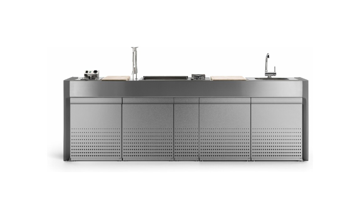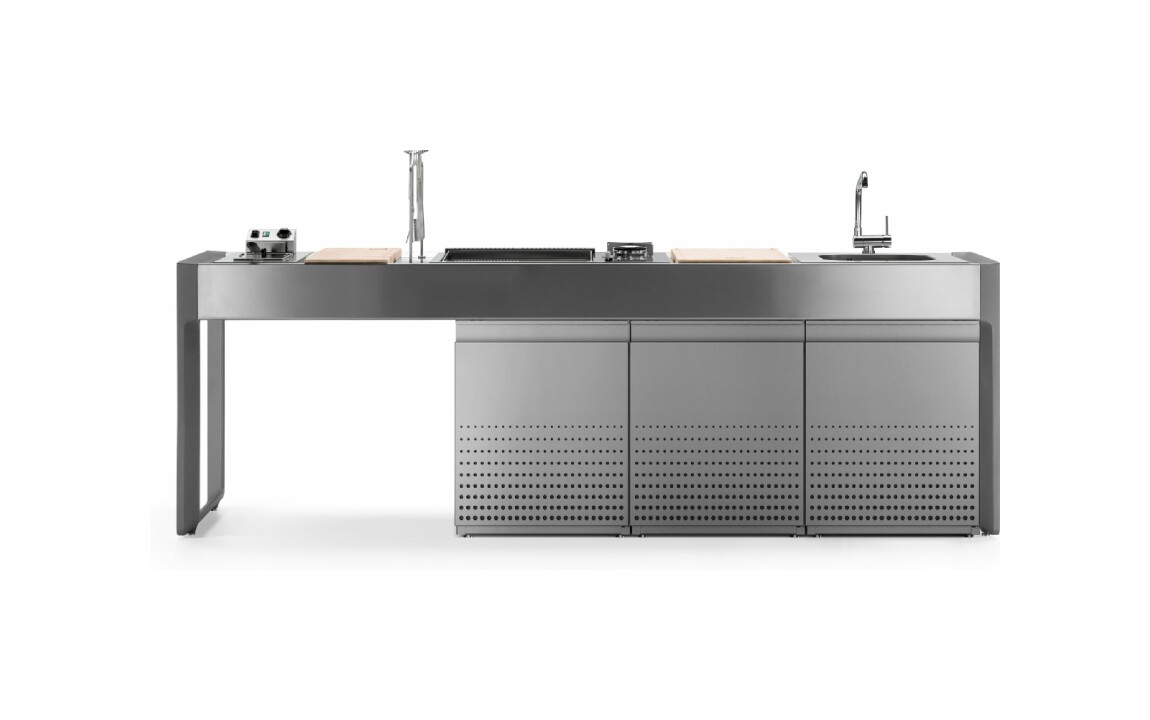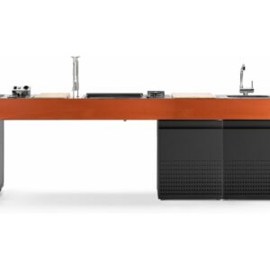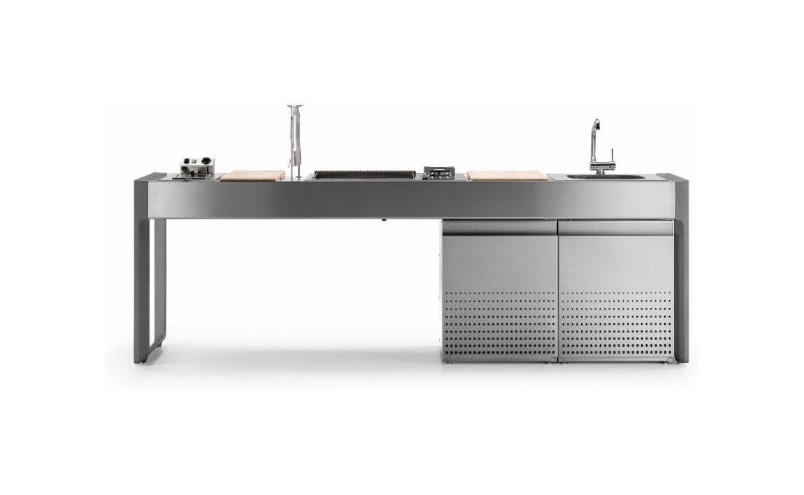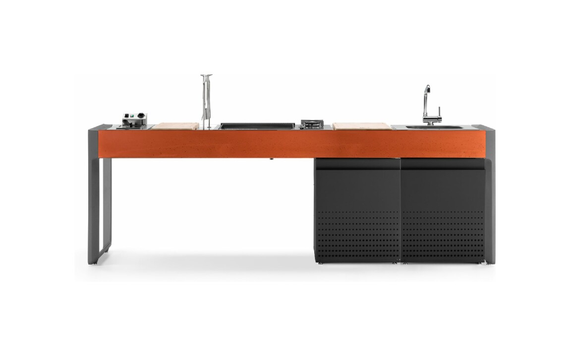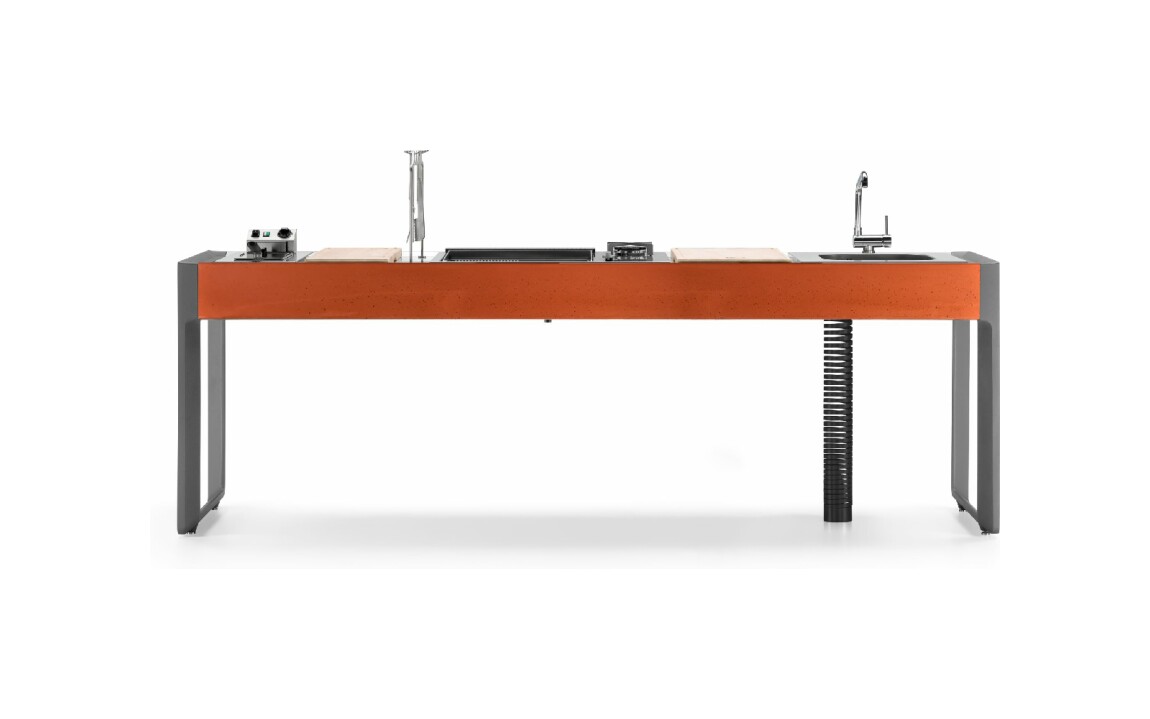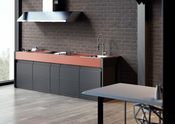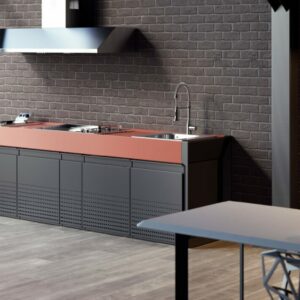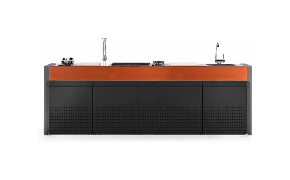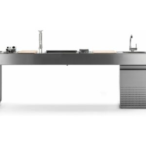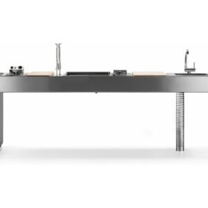 Küche mit Aluminiumstruktur, mit Edelstahl- oder UHPC-Platte. Dafne ist mit Gas- oder Elektroantrieb erhältlich. Die Küche kann mit einem Kochfeld mit Gasherd und Kochplatte oder einer elektrischen Teppanyaki-Platte, Spüle und Fritteuse ausgestattet werden. Die Edelstahlversion ist auch mit einem Gaskochfeld mit Grill erhältlich. Wie alle Outra-Küchen ist sie mit Industrie-4.0-Technologie ausgestattet. Jede Outra-Küche wird mit handwerklicher Sorgfalt behandelt, die die Qualität der in Italien hergestellten Produkte respektiert.
