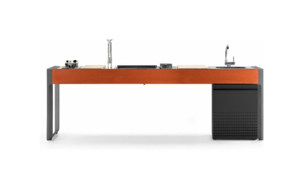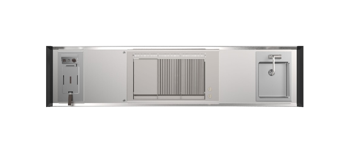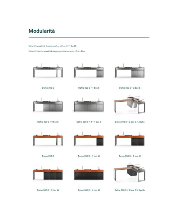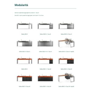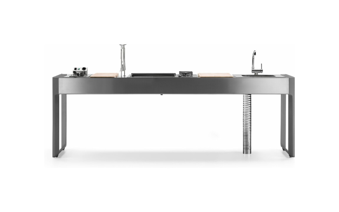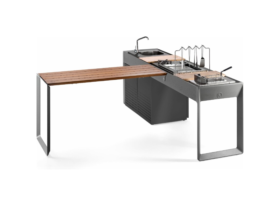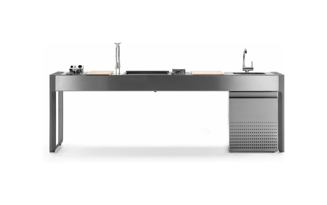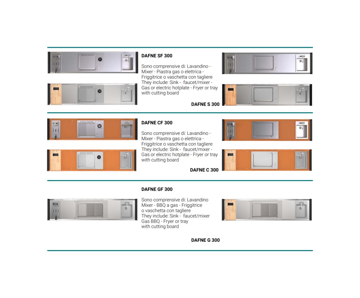 Küche mit Aluminiumstruktur, mit Edelstahl- oder UHPC-Platte. Dafne ist mit Gas- oder Elektroantrieb erhältlich. Die Küche kann mit einem Kochfeld mit Gasherd und Kochplatte oder einer elektrischen Teppanyaki-Platte, Spüle und Fritteuse ausgestattet werden. Die Edelstahlversion ist auch mit einem Gaskochfeld mit Grill erhältlich. Wie alle Outra-Küchen ist sie mit Industrie-4.0-Technologie ausgestattet. Jede Outra-Küche wird mit handwerklicher Sorgfalt behandelt, die die Qualität der in Italien hergestellten Produkte respektiert.