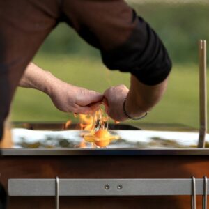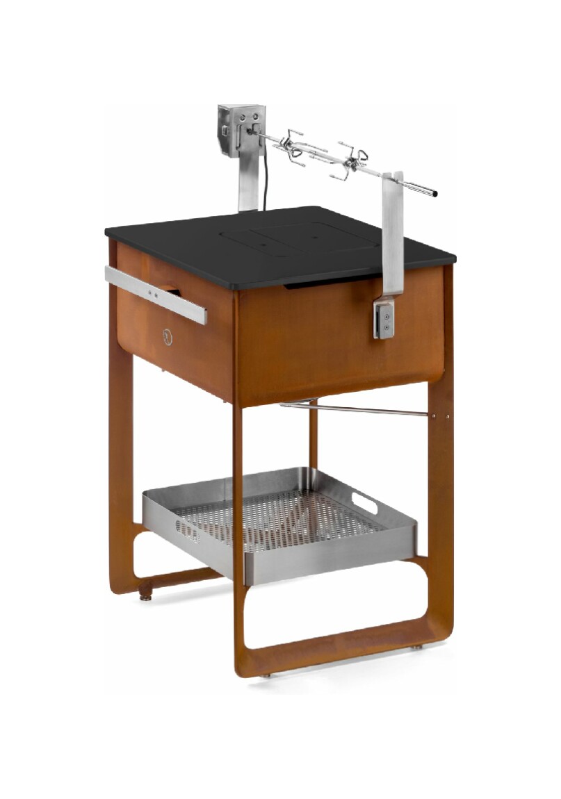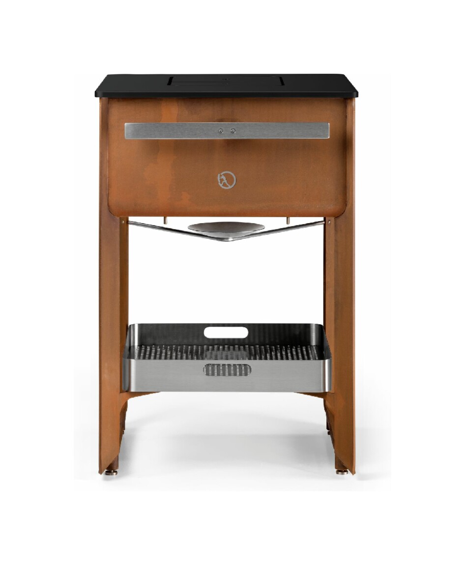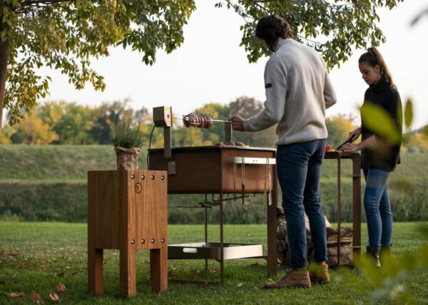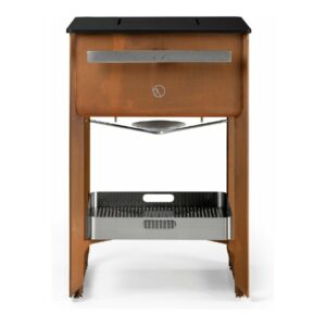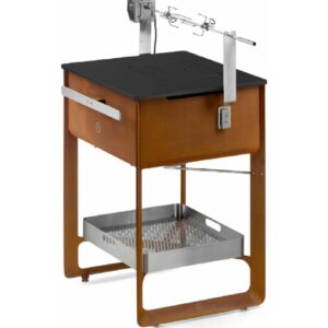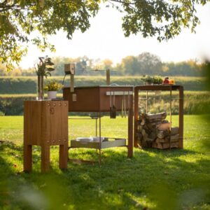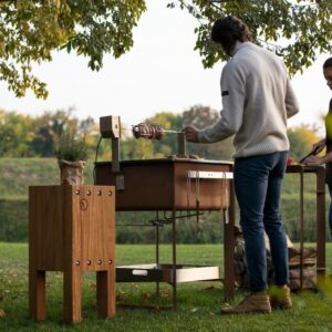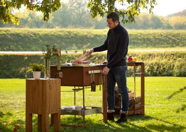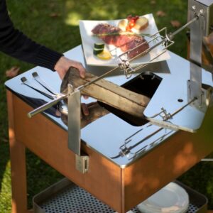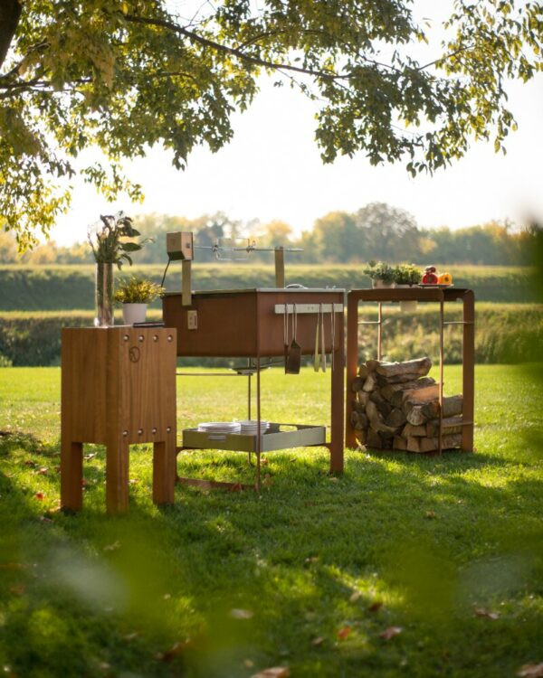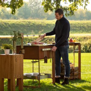 Holzbefeuerte Kochplatte aus Stahl, ausgestattet mit einem Futterbecken aus feuerfestem Material. Die Küche verfügt über einen Werkzeughalter aus satiniertem 304L-Edelstahl und kann mit einem Drehspieß (separat erhältlich) ausgestattet werden. Prometeo ist ideal zum Kochen im Freien.