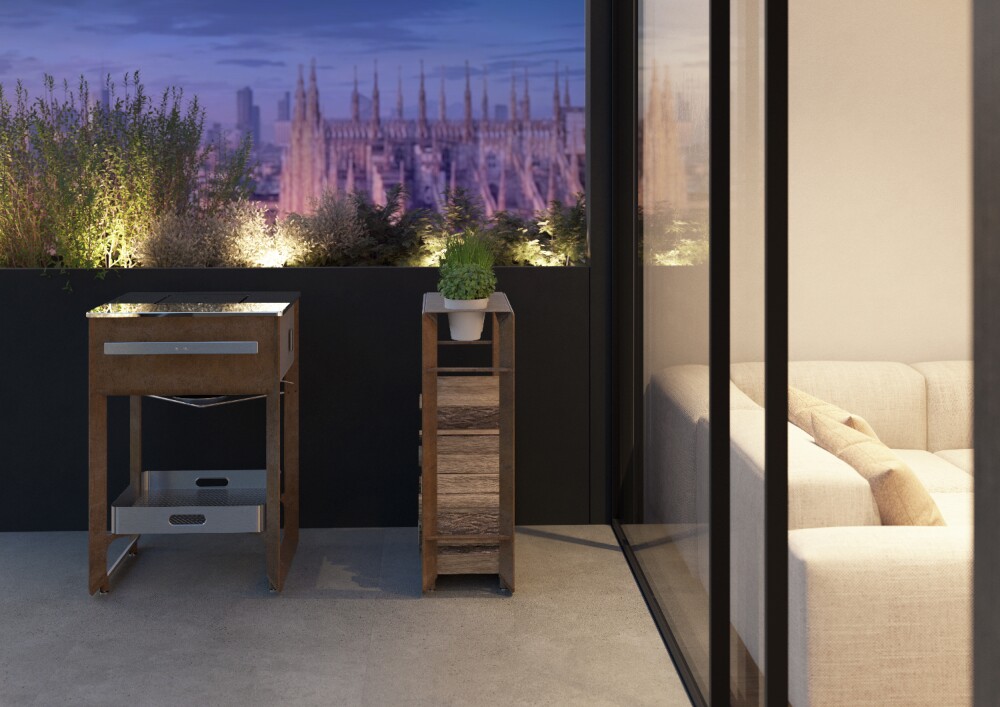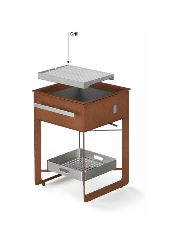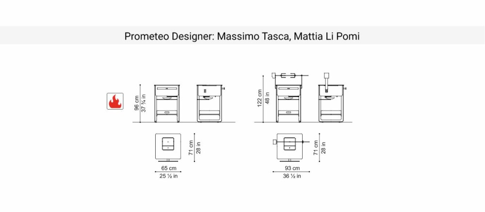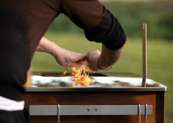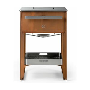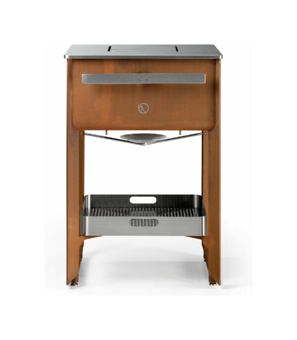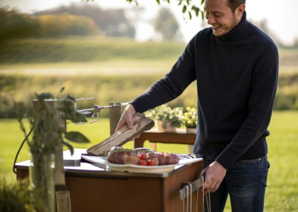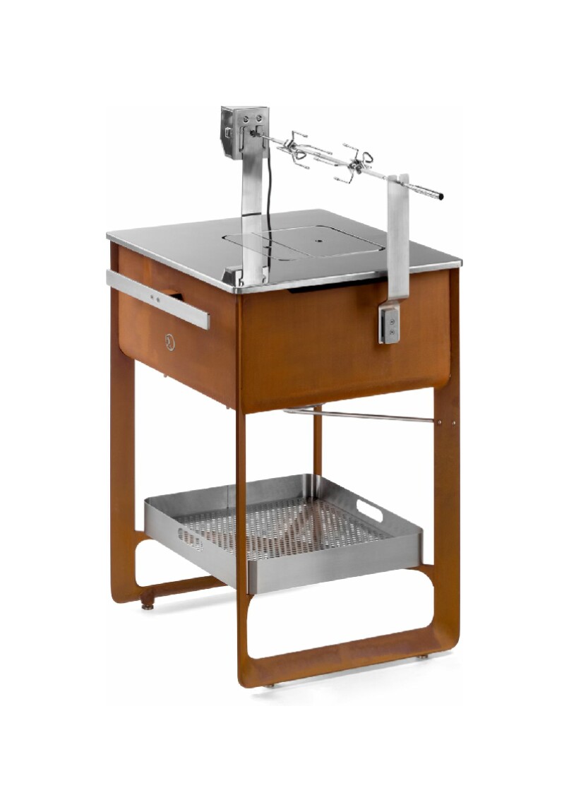 Holzbefeuerte Kochplatte aus Stahl, ausgestattet mit einem Futterbecken aus feuerfestem Material. Die Küche verfügt über einen Werkzeughalter aus satiniertem 304L-Edelstahl und kann mit einem Drehspieß (separat erhältlich) ausgestattet werden. Prometeo ist ideal zum Kochen im Freien.