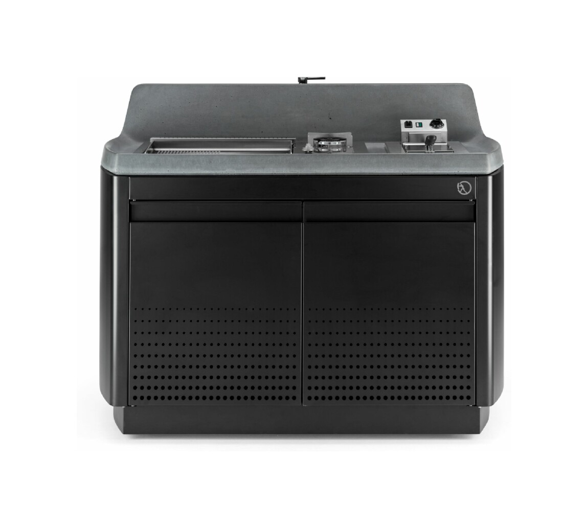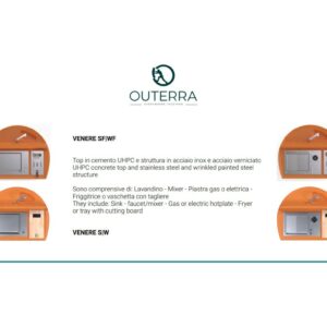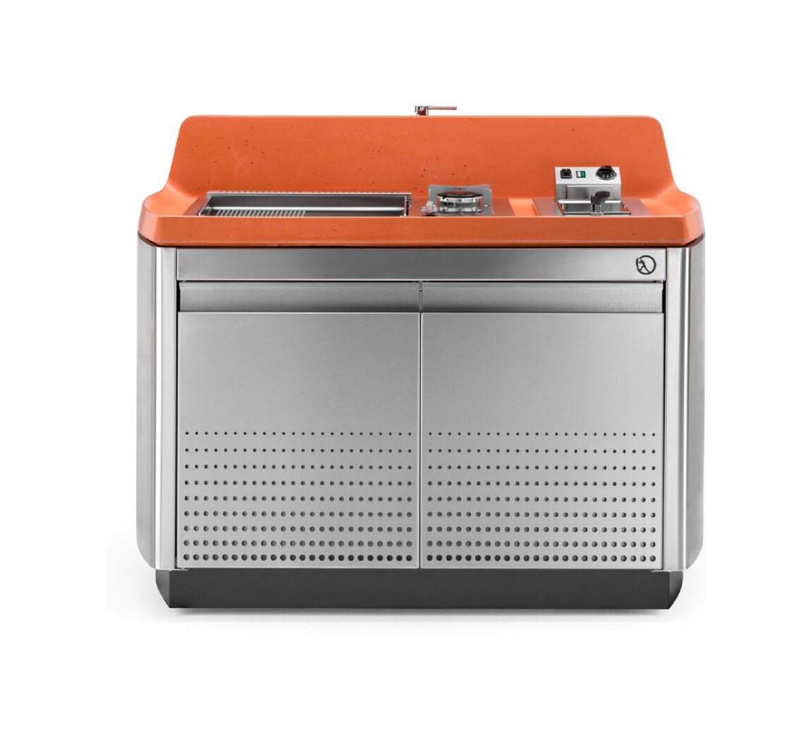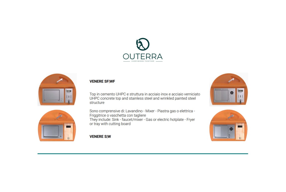 Kücheninsel mit Stahlkonstruktion, ausgestattet mit vier Schwenkrädern, mit Oberfläche aus UHPC-Beton, ausgestattet mit Spritzschutz und Spüle. Die Küche verfügt über ein Kochfeld mit Herd und Teppanyaki-Platte sowie ein Fach mit zwei Türen, in dem sich eine Gläserspülmaschine, ein Eiswürfelbereiter und ein Kühlschrank (separat erhältlich) befinden. Venere ist in einer Gas- oder Elektroversion erhältlich. Wie alle unsere Küchen ist sie mit Industrie 4.0-Technologie ausgestattet. Jede Outra-Küche wird mit handwerklicher Sorgfalt behandelt, die die Qualität der in Italien hergestellten Produkte respektiert.