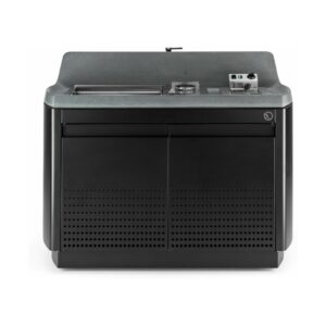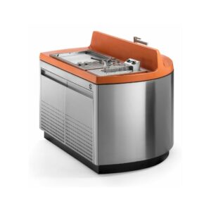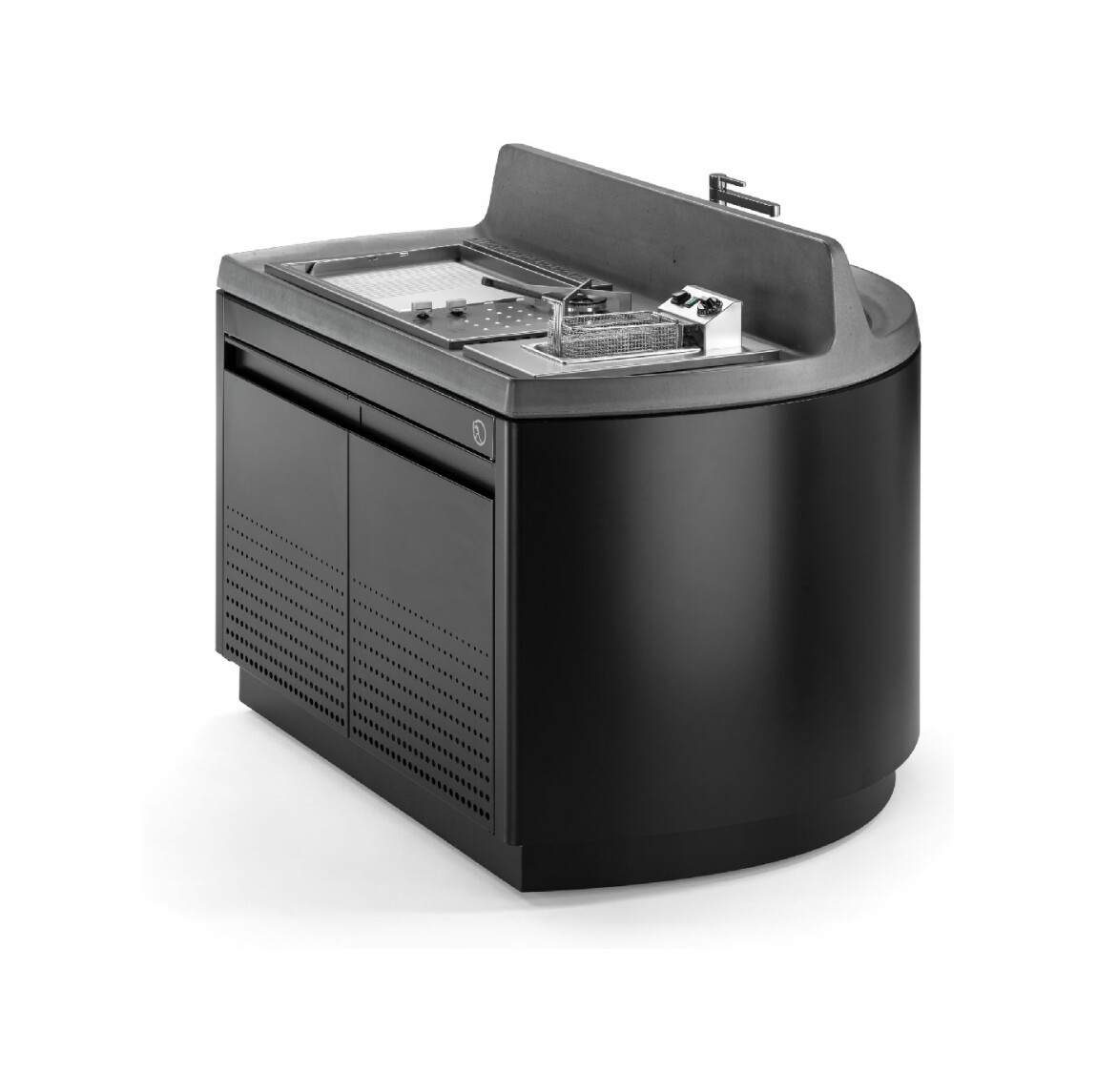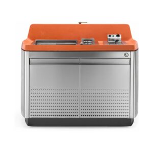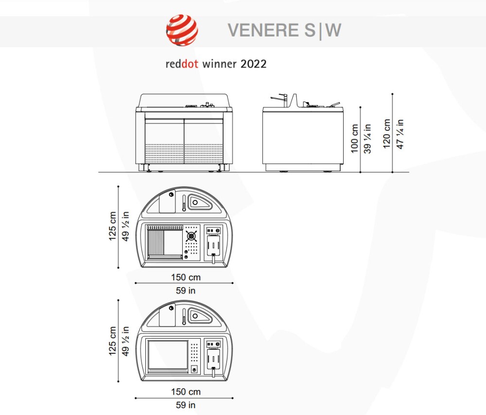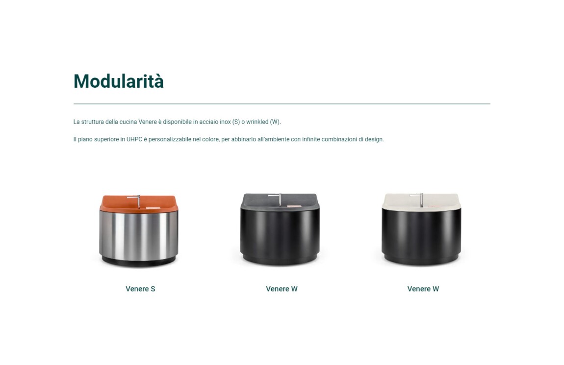 Kücheninsel mit Stahlkonstruktion, ausgestattet mit vier Schwenkrädern, mit Oberfläche aus UHPC-Beton, ausgestattet mit Spritzschutz und Spüle. Die Küche verfügt über ein Kochfeld mit Herd und Teppanyaki-Platte sowie ein Fach mit zwei Türen, in dem sich eine Gläserspülmaschine, ein Eiswürfelbereiter und ein Kühlschrank (separat erhältlich) befinden. Venere ist in einer Gas- oder Elektroversion erhältlich. Wie alle unsere Küchen ist sie mit Industrie 4.0-Technologie ausgestattet. Jede Outra-Küche wird mit handwerklicher Sorgfalt behandelt, die die Qualität der in Italien hergestellten Produkte respektiert.