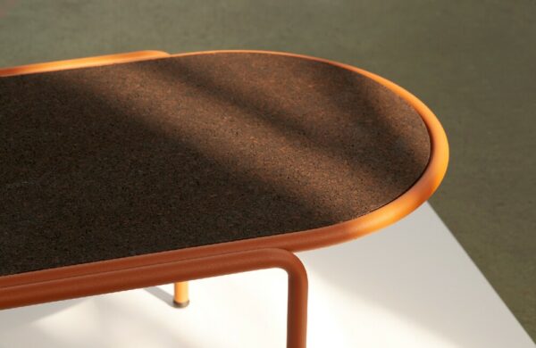 Die Platte besteht aus lackiertem Stahl , passend zum Gestell, oder aus HPL oder schwarzem Kork.