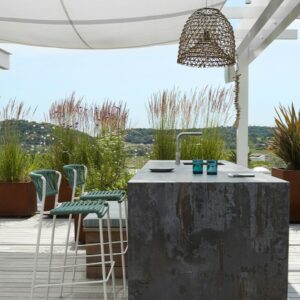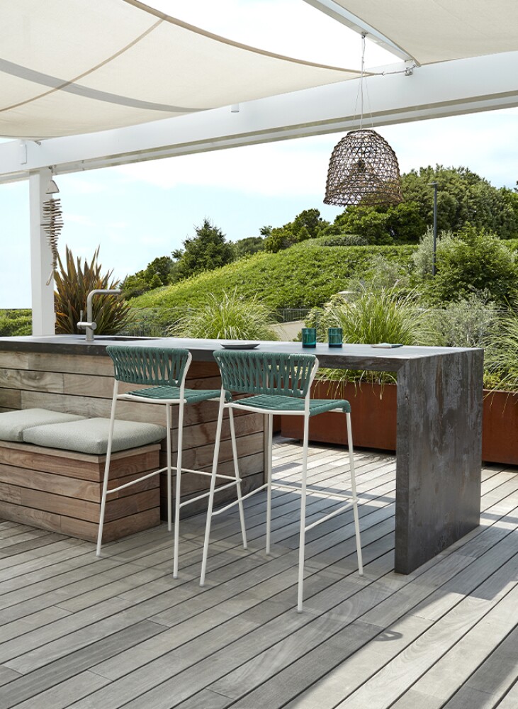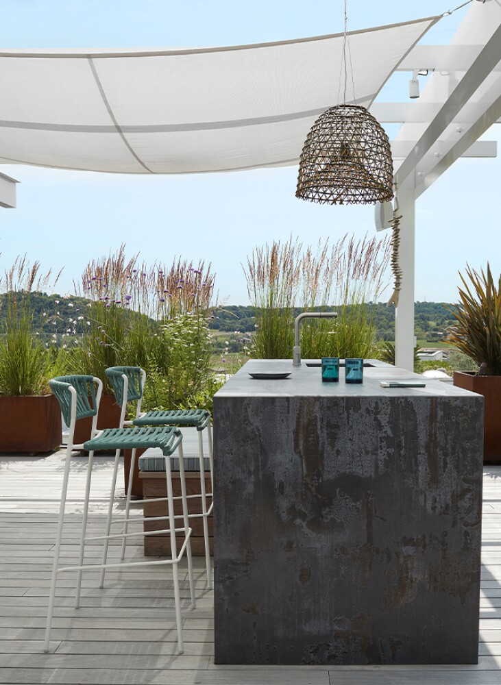 Es wurde hauptsächlich für den Objektbereich konzipiert, um Bars und Restaurants entlang der Strandpromenade einen Hauch von sommerlicher Unbeschwertheit zu verleihen, kann aber auch in häuslichen Kontexten wie der Küchenhalbinsel verwendet werden.