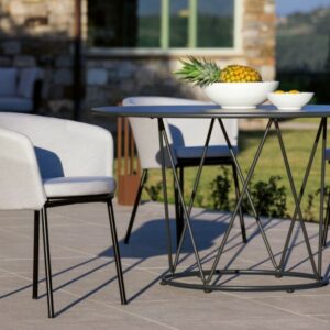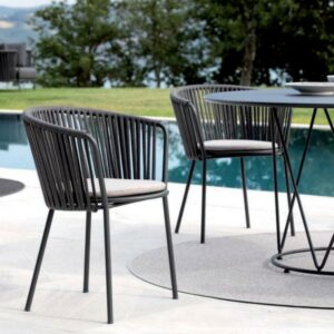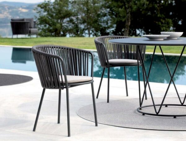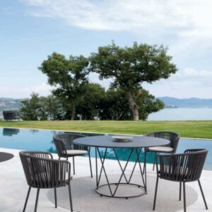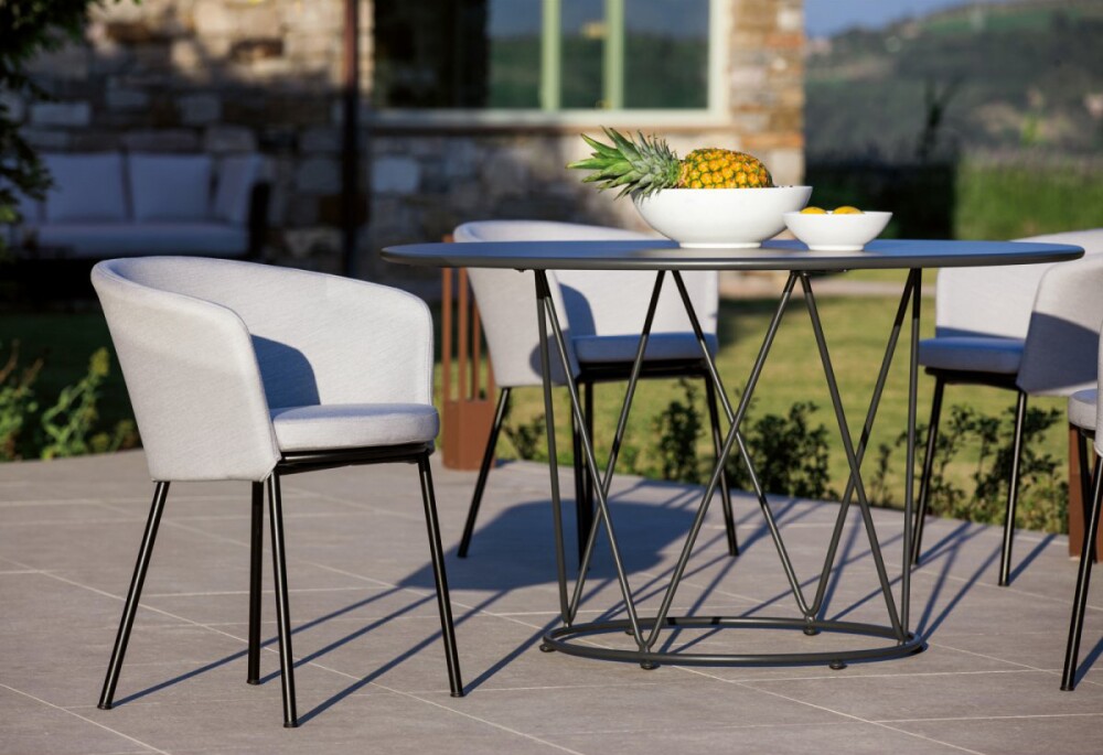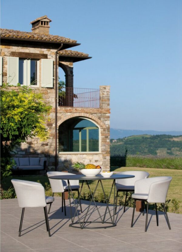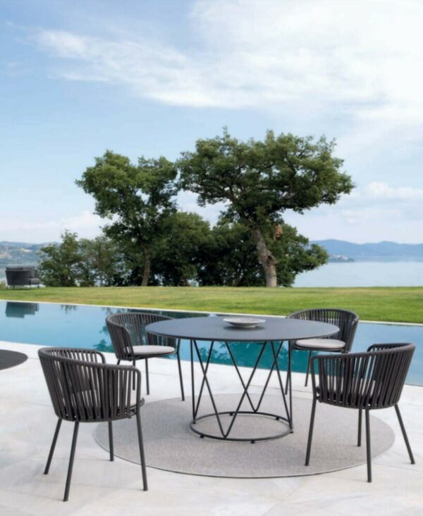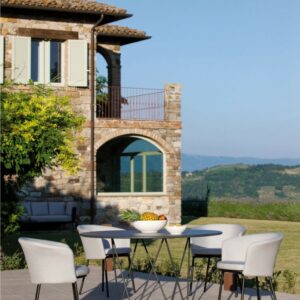 Eine Kollektion mit zeitgenössischem Geschmack, in der die Verflechtung grundlegender geometrischer Formen und wesentlicher Linien eine dynamische und funktionale Atmosphäre schafft . Das Wohnzimmer im Freien wird zu einem fließenden und manchmal traumhaften Raum, der sich perfekt in jede Umgebung integriert.